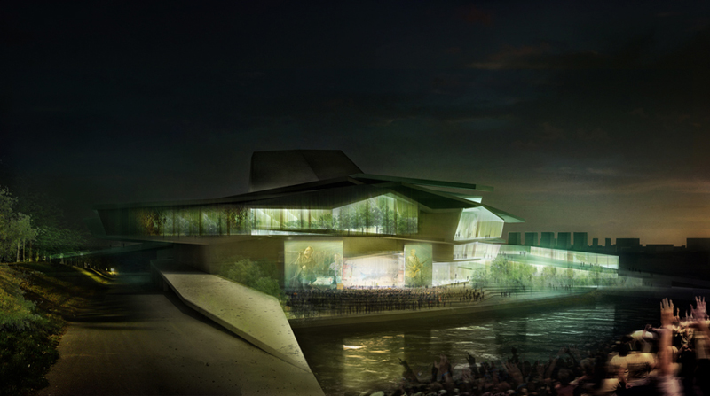 The centre expresses a human scale with an extensive number of accessible roofs at varying levels, creating shaded outdoor spaces for impromptu gatherings and events. The use of glass illuminates external surfaces and dapples light through the lush green landscape. This sensation will be particularly effective in the Grand Foyer where lush internal planting and a huge interactive light installation is inspired by flock behaviour. This flexible space allows for multiple functions and is linked to both the lyric and the multiform theatres, and as a large open space, becomes an event space where audiences pour from the halls into a densely vegetated space. To reinforce accessibility and monumentality, the roof-scape is openly accessible to the general public, with planted landscapes laid out on horizontal and sloping roofs. The proposal will achieve a low-carbon impact using green technologies which will enhance eco-efficiency, minimizing any adverse environmental impacts.