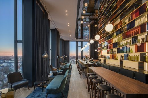 Weaving state-of-the-art technology and old traditions into the interior, reflecting what makes Munich unique, forming a sense of tension that can be found throughout the hotel design. The ceiling structure illustrates this contrast via a literally interwoven network of rough wood and high-gloss anodised metal. The connecting axis between the various areas which brings all functions together in a single hybrid space (‘we share’) is a lively place to meet and mingle.