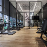 The double storey height fourth floor gym allows for exercise to be taken in both the open air and air conditioning, incorporating a fully glazed view of the pool and deck. The first bay of the gym is a covered open space with equipment stations and is proving to be popular with residents. The gym area design includes the simple black framing and photographic artworks established in the lower floors and uses extensive mirrors to visually extend the space and bring the landscaped deck into the interior.