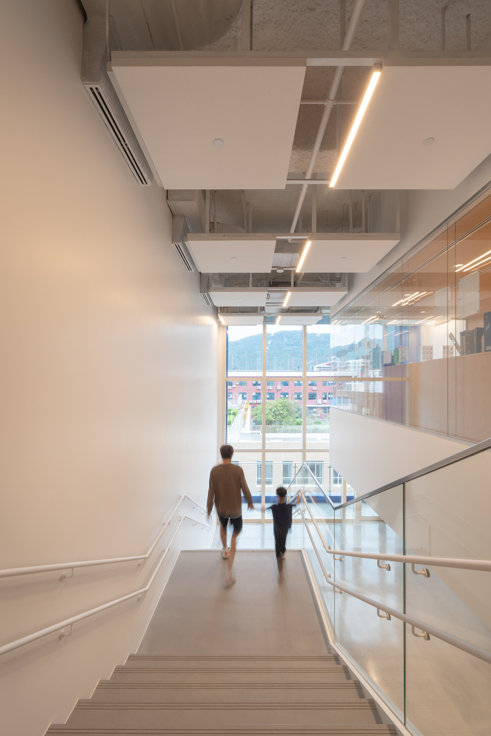 Inside the building, a climbing wall is installed as a centrally located focal point, where activities can be shared and learned. The pleated climbing wall is nested within a space open to the sky and sits adjacent to a covered playground. The sectional height difference between the playground and the climbing wall creates a dramatic light effect—the natural light washes down the wall, lending a sense of uplift to the space.