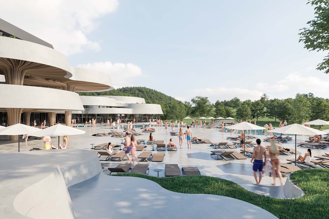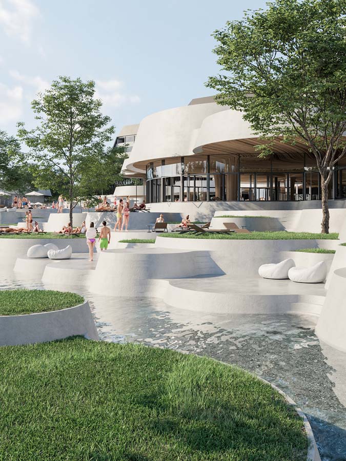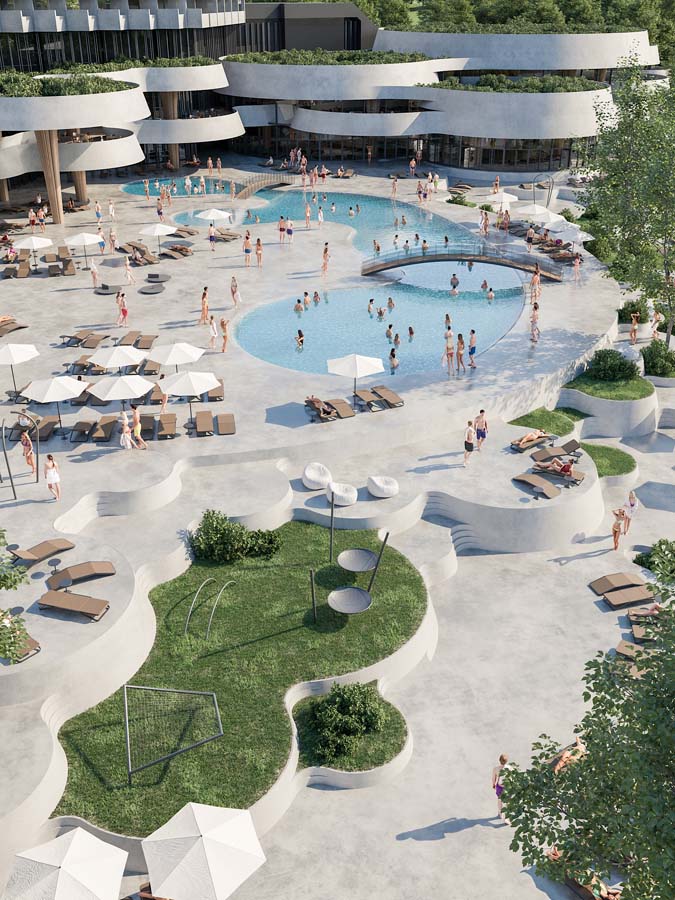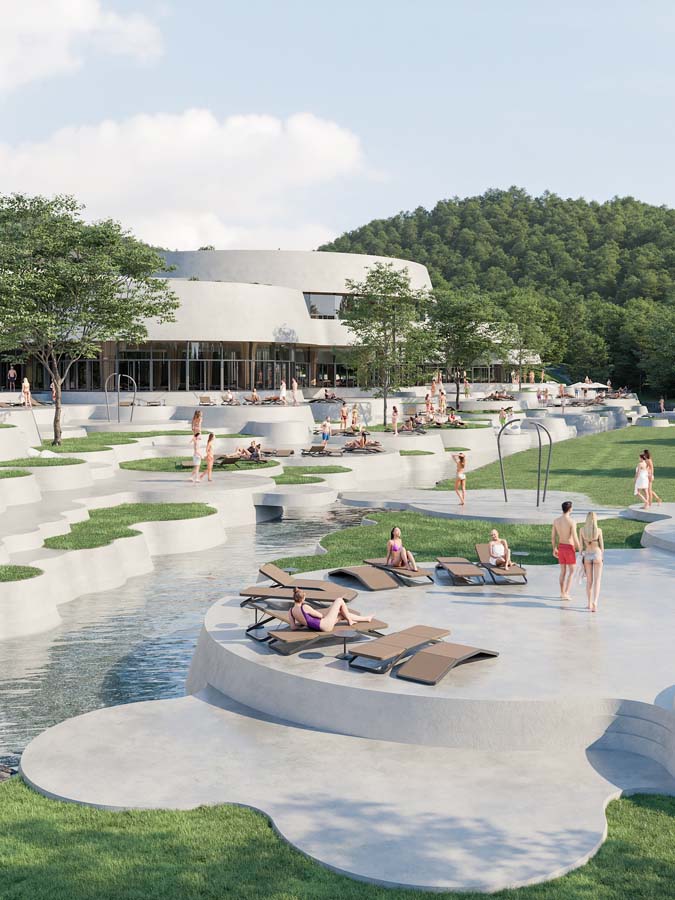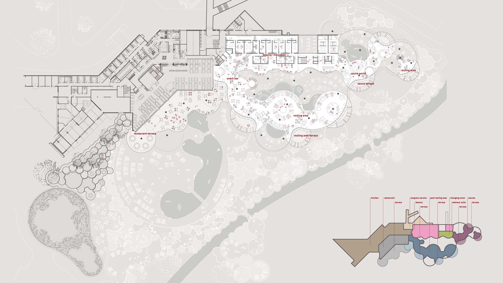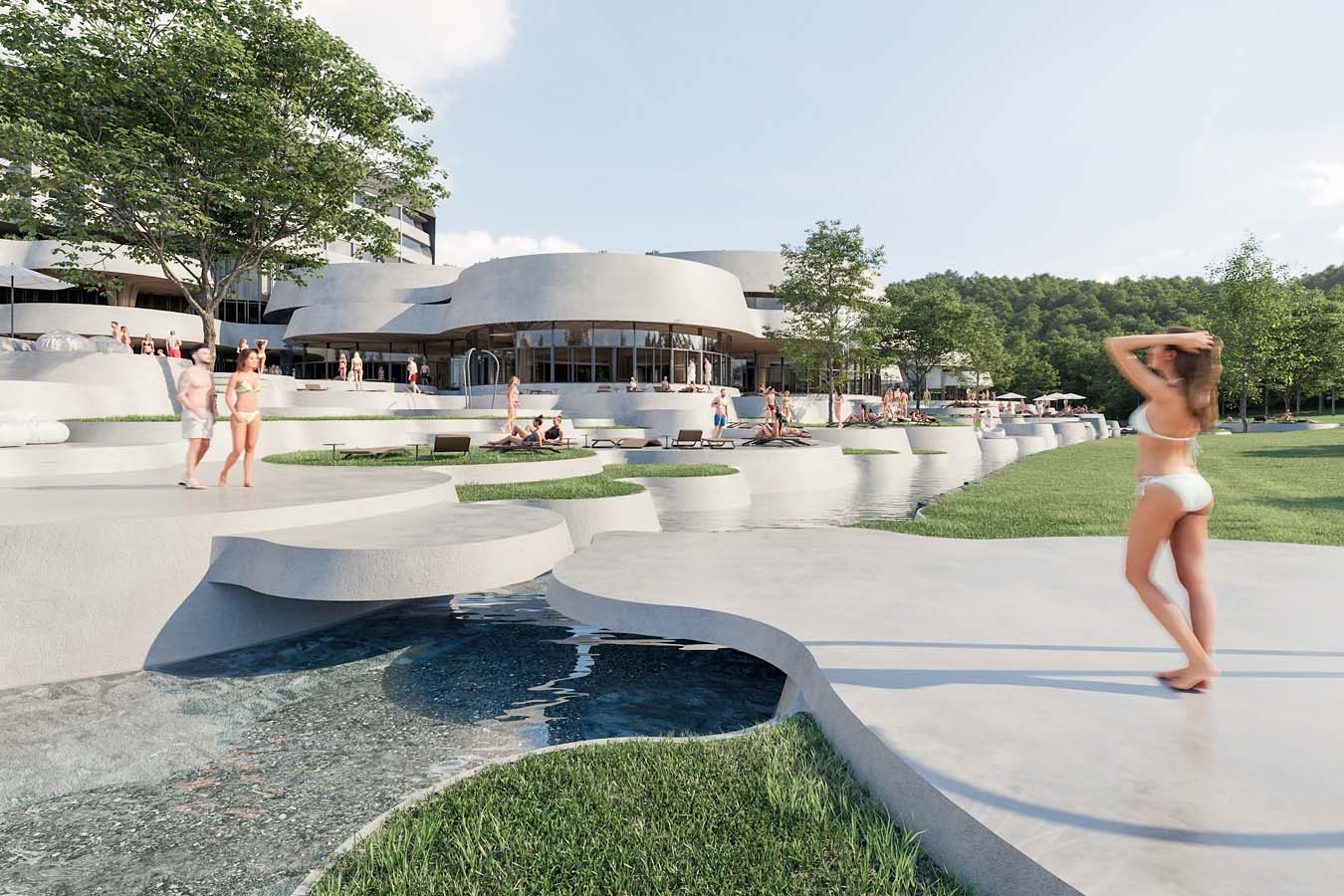 One of the key goals of the renovation is making the waterside of stream Jelića part of the exterior functional surfaces in order to provide a welcome content enhancement by means of the water element. At the same time, the inclusion of this surface allows for future expansion of wellness programmes on available plots on the other side of the stream. The uniform treatment of the space from the stream to the hotel’s ground level, which also encompasses the first two storeys of the pubic programme, together with the covering of the new pool section, perceptually diminishes the hotel building from seven to five floors. Using the ground level, the new terraced structure of the layout with overhanging roofing further reduces the appearance of the existing building and brings the entire layout closer to the human scale. The individual terraces of the exterior layout and the roofs of the new buildings feature ample greenery, certainly a welcome characteristic of an environment where well-being is foremost dependent on nature. On the other hand, the green roofs bridge the gap to the ground level for room users as the view across the roofs continues unbroken to the ground floor layout and further afield to the natural landscape at the other side of the stream.
