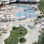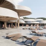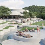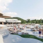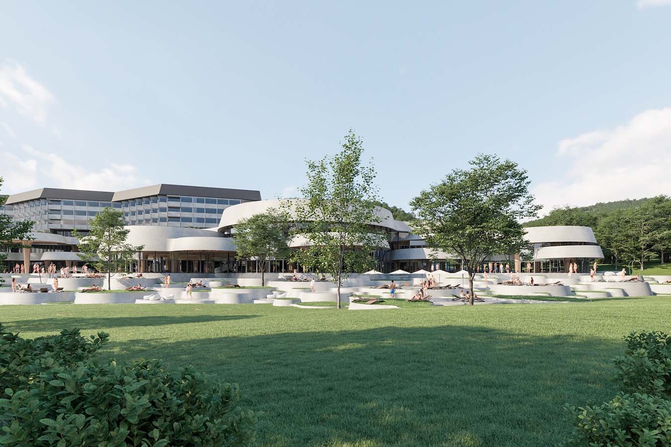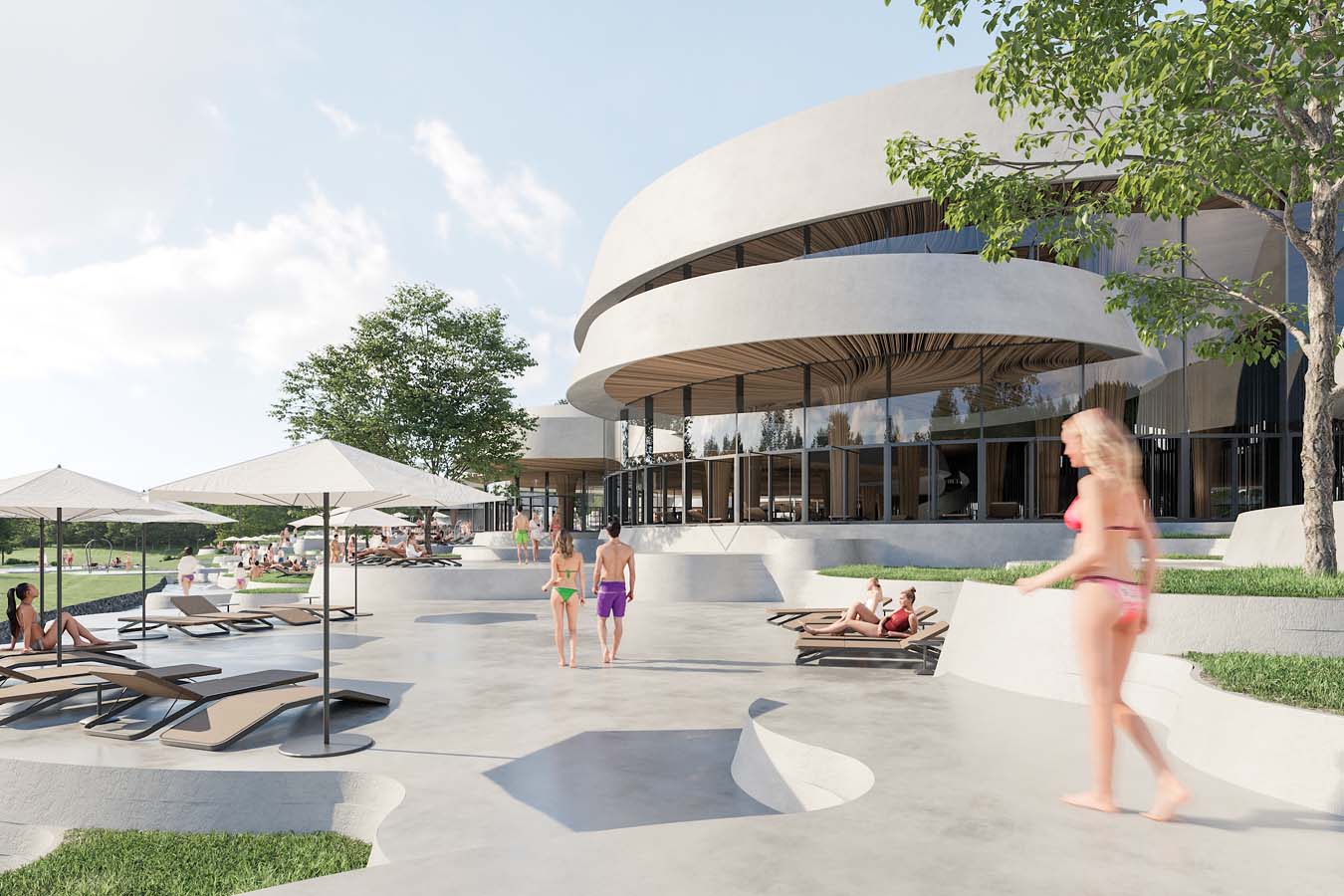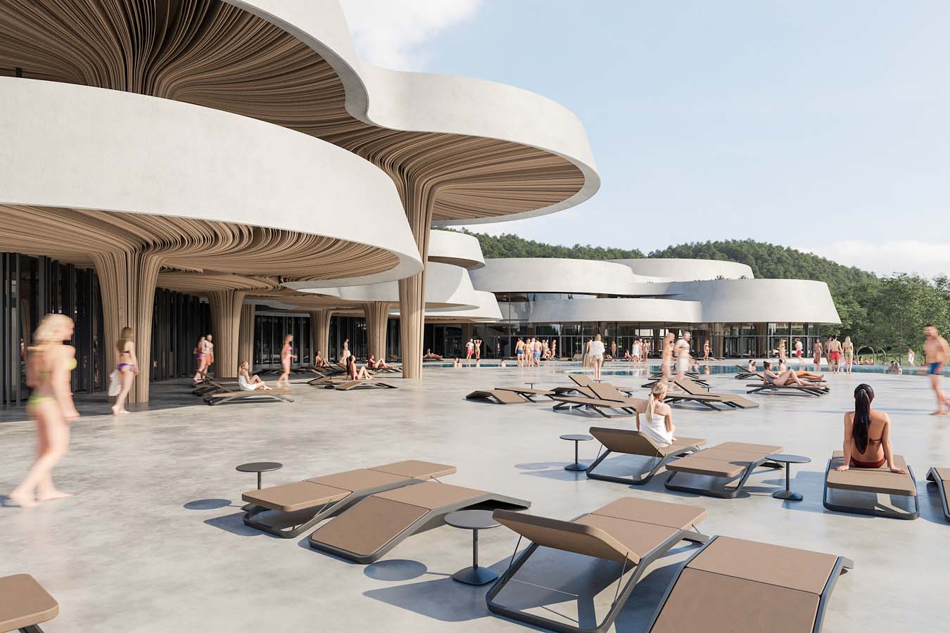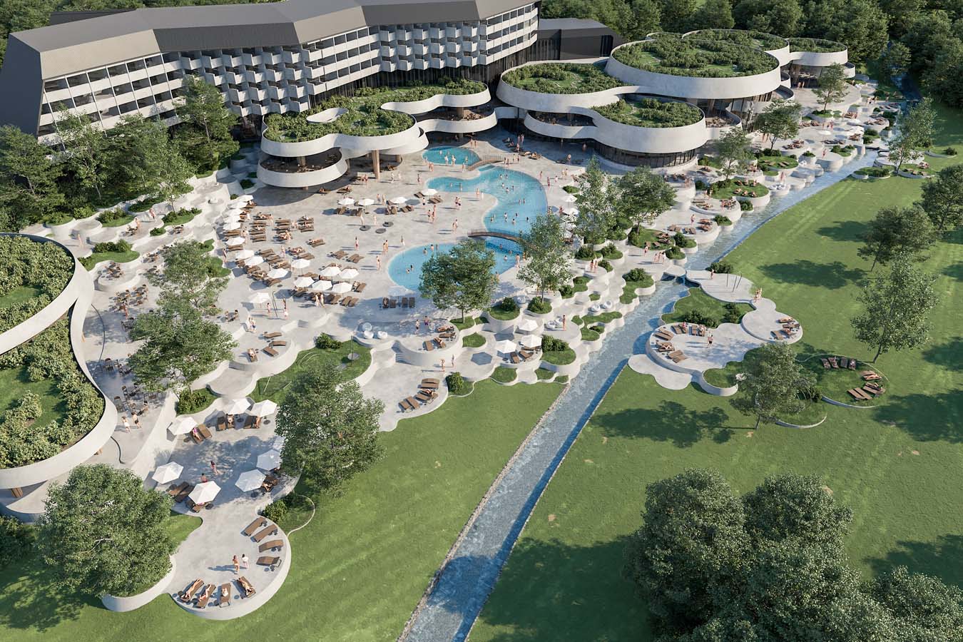 One of the key goals of the renovation is making the waterside of stream Jelića part of the exterior functional surfaces in order to provide a welcome content enhancement by means of the water element. At the same time, the inclusion of this surface allows for future expansion of wellness programmes on available plots on the other side of the stream. The uniform treatment of the space from the stream to the hotel’s ground level, which also encompasses the first two storeys of the pubic programme, together with the covering of the new pool section, perceptually diminishes the hotel building from seven to five floors. Using the ground level, the new terraced structure of the layout with overhanging roofing further reduces the appearance of the existing building and brings the entire layout closer to the human scale. The individual terraces of the exterior layout and the roofs of the new buildings feature ample greenery, certainly a welcome characteristic of an environment where well-being is foremost dependent on nature. On the other hand, the green roofs bridge the gap to the ground level for room users as the view across the roofs continues unbroken to the ground floor layout and further afield to the natural landscape at the other side of the stream.