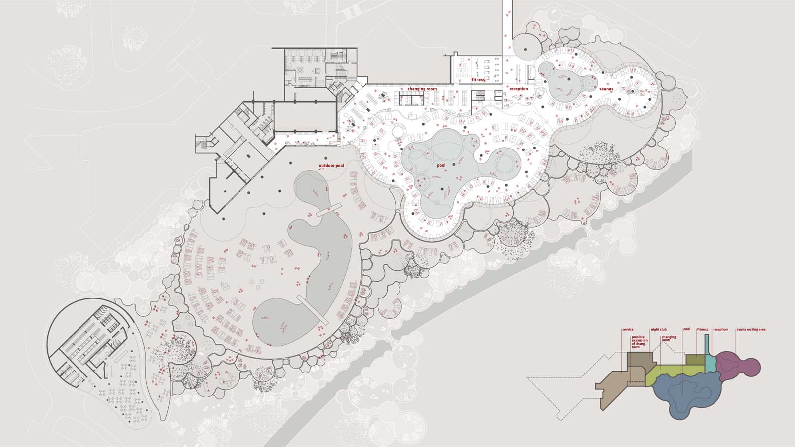 The new appended spaces are accessible through the new reception area, which connects to the existing underground corridor and the outside-guest entrance. Additionally, Hotel Kardial guests can take advantage of the direct access to the wellness programme and the swimming pool locker room, which also serves as the gateway to the new sauna parlours. The swimming pool hall is divided into two different sections. The larger of the two is intended for families and connects to the existing external pool on the same level with additional pertaining surfaces being placed on the gallery floor above the pool. The other, smaller section is located above the pool on the primary – gallery level where the saunas and associated programmes are also found. This part of the facility boasts its own separate exterior surfaces and is intended for more demanding guests.