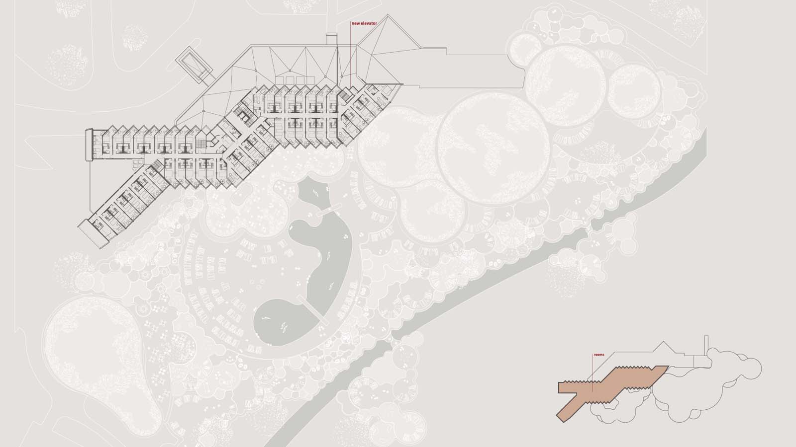 Hotel Kardial has recently undergone extensive refurbishment. The overhaul reduced the size of the balconies in order to enlarge the hotel rooms, further rooms were added on the building’s roof, and all the accompanying programmes were overhauled, namely the congress halls and the wellness facility, which comprises the interior and exterior pool, and sauna and massage parlours. The final addition was an exterior pool platform with accompanying service spaces at the outside-guest entrance. The subsequent use of the refurbished building revealed that the interior pool section was too small and somewhat inconveniently placed above the exterior pool platform. This resulted in the sauna and massage parlours being located on the lower floor, which is to the detriment of optimal organisation of the spaces and service. The spaces in question also exhibit a number of technical issues stemming from the refurbishment. From the investment standpoint, it makes the most sense for these spaces to be removed and replaced with new ones, eliminating the current shortcomings, subject to appropriate planning. Notwithstanding the removal of the enclosed spaces, all the exterior spatial layout, i.e. the exterior pool and the service entrance facility, is to be retained.