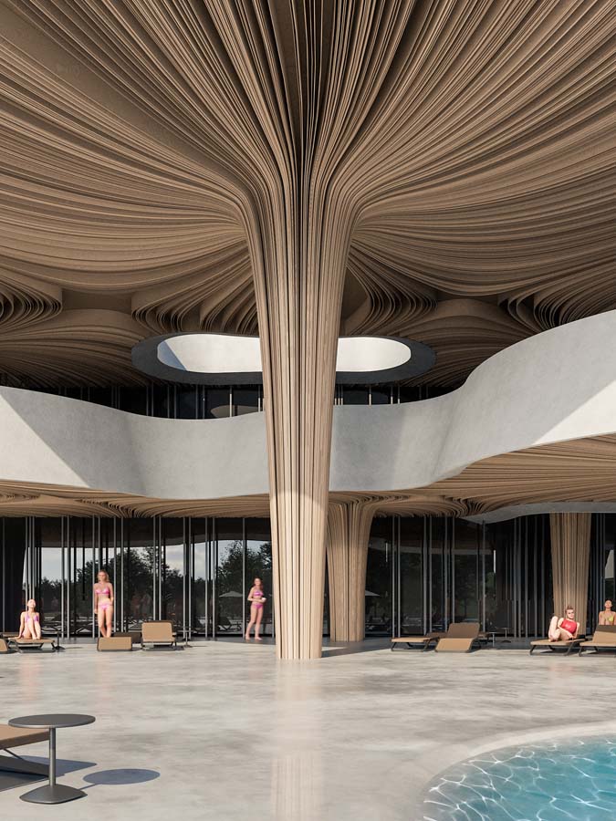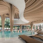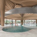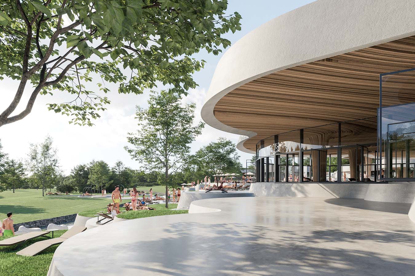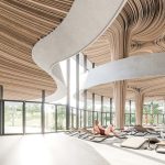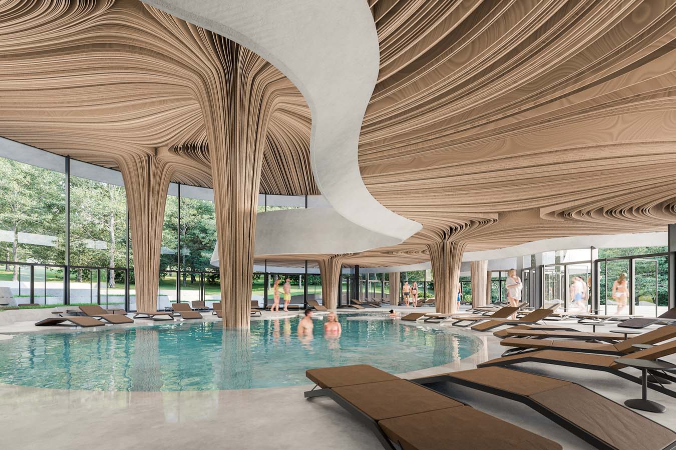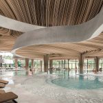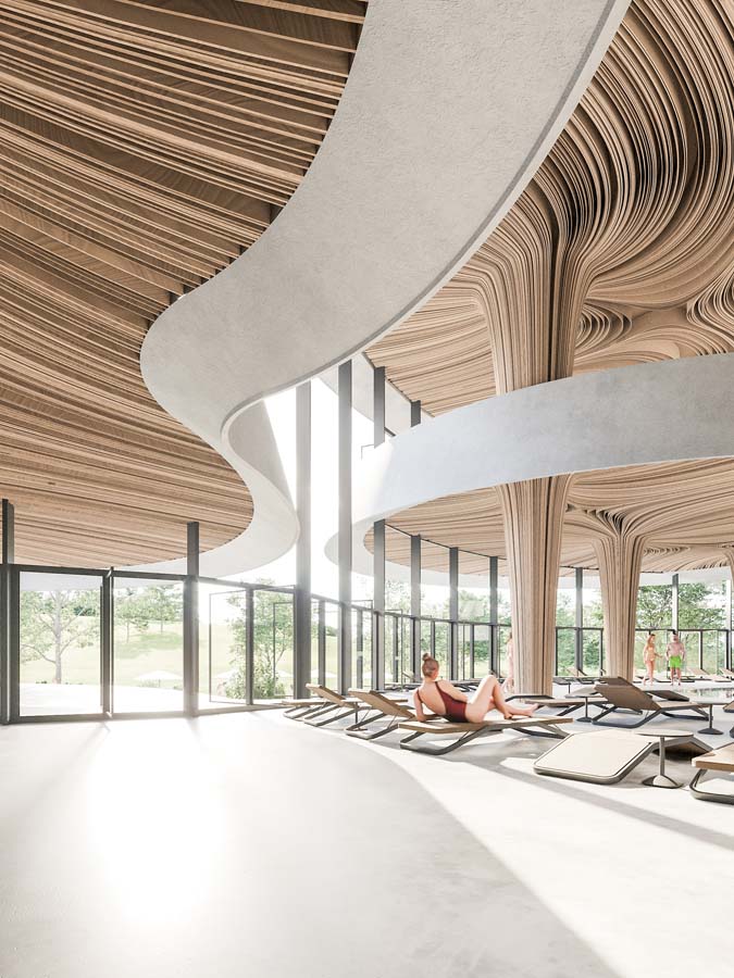The fundamental guideline for the design of the new building’s interior was to produce a sensation of constant connection to the external, natural landscape. The main load-bearing structure of the individual roof elements has thus been shifted into the building’s interior. The perimeter glass facade, which still features a secondary load-bearing structure, contiguously envelops the building and ensures uninterrupted contact with the surrounding landscape. In spring and in autumn, temperature-permitting, the entire glass perimeter may be opened in order to provide an even better connection between the interior and the exterior. The new swimming pool building’s volume is divided into several smaller roof segments whose respective levels separate them from one another, yet they are still linked in a unified structural system. The elevation shifts also enable clerestory lighting deeper in the space’s interior. The interior ceiling is additionally clad with a suspended timber structure which conceals all the necessary installations and lighting. The organic, undulating ceiling pattern reflects the basic desire for the highest degree of connection with nature while the wood offers a sensation of warmth in this very bright and open relaxation space.