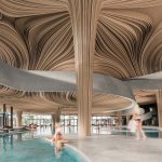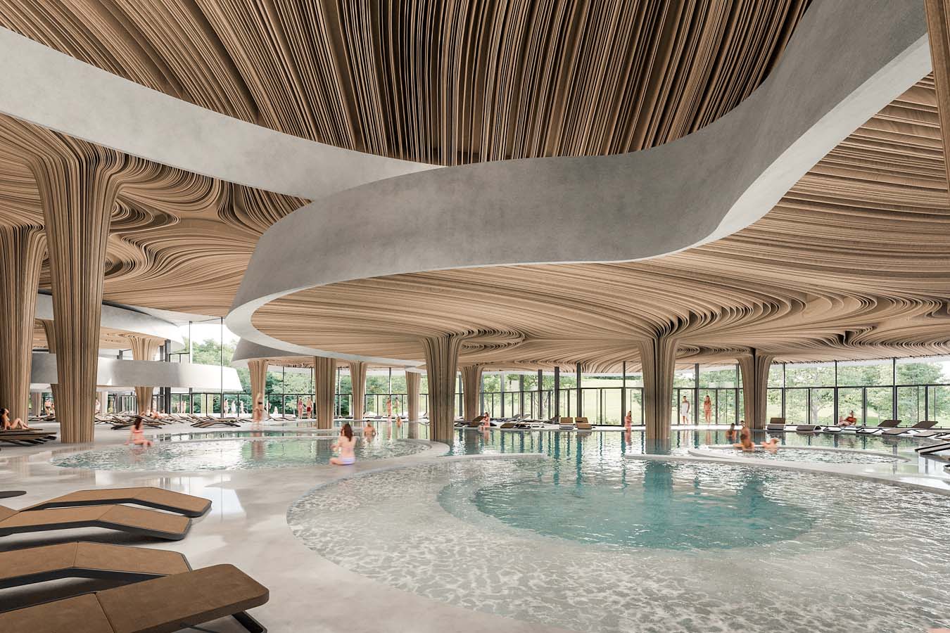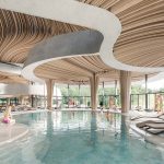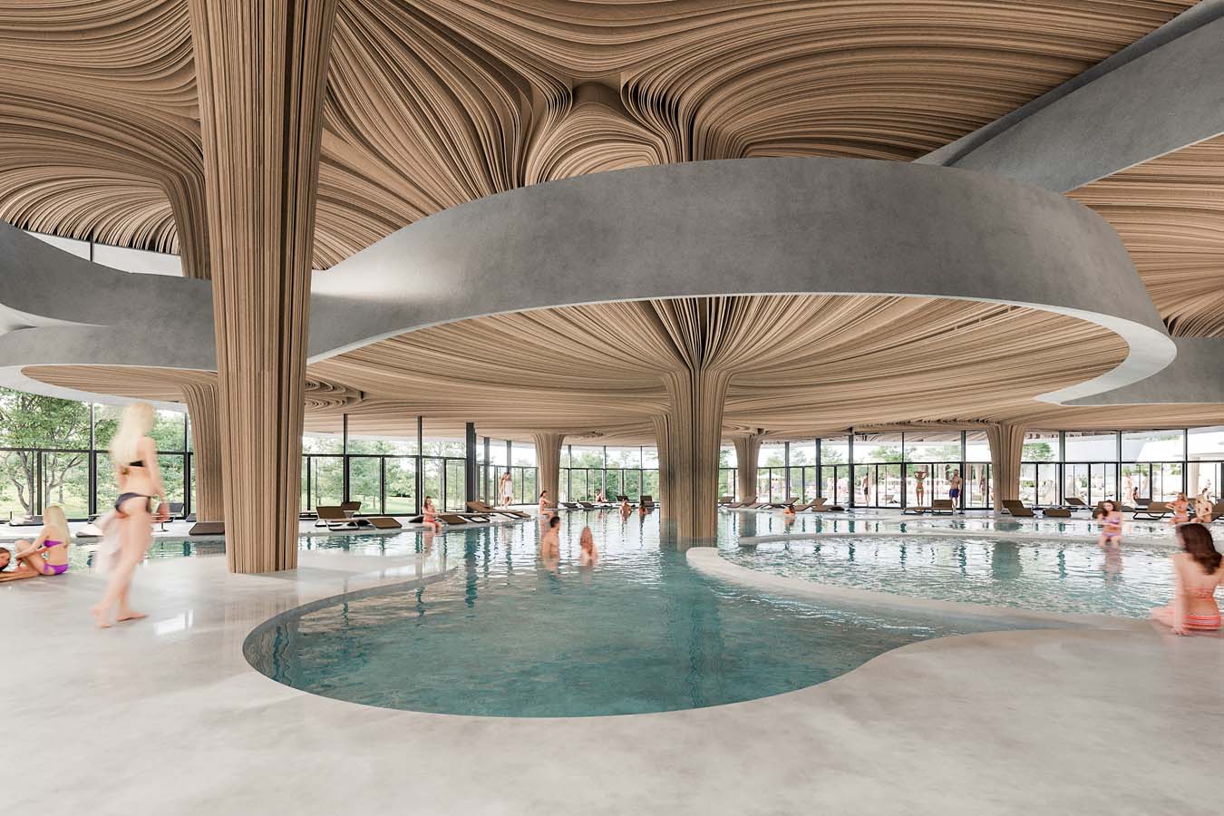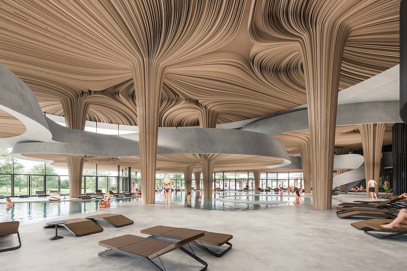 The fundamental guideline for the design of the new building’s interior was to produce a sensation of constant connection to the external, natural landscape. The main load-bearing structure of the individual roof elements has thus been shifted into the building’s interior. The perimeter glass facade, which still features a secondary load-bearing structure, contiguously envelops the building and ensures uninterrupted contact with the surrounding landscape. In spring and in autumn, temperature-permitting, the entire glass perimeter may be opened in order to provide an even better connection between the interior and the exterior. The new swimming pool building’s volume is divided into several smaller roof segments whose respective levels separate them from one another, yet they are still linked in a unified structural system. The elevation shifts also enable clerestory lighting deeper in the space’s interior. The interior ceiling is additionally clad with a suspended timber structure which conceals all the necessary installations and lighting. The organic, undulating ceiling pattern reflects the basic desire for the highest degree of connection with nature while the wood offers a sensation of warmth in this very bright and open relaxation space.