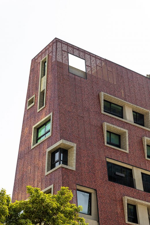 The skin covering the building also provides thermal comfort to the units. Away from the masonry, it provides shading of the fences and good ventilation through a mattress of renewable air. From that perspective, sustainability guided a large part of the project’s choices. Due to the reduced dimensions of the land, and minimal rooftop space for installing equipment or photovoltaic panels, it was necessary to find a solution that would avoid the entry of heat, to the detriment of an air conditioning project.