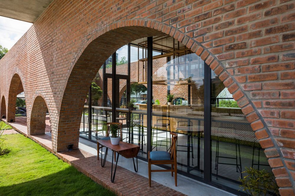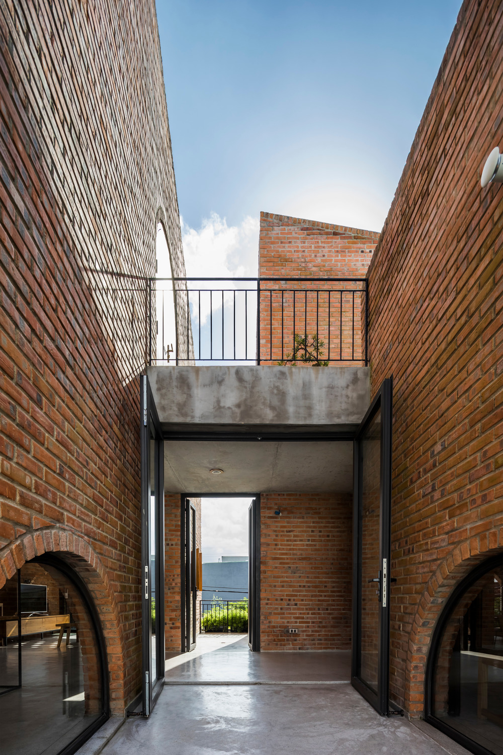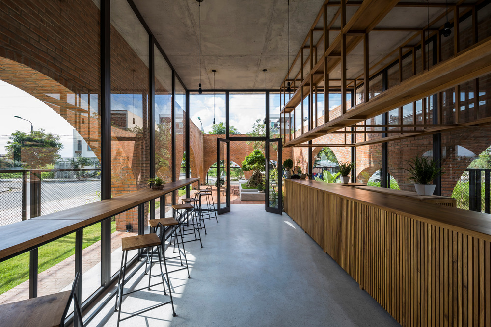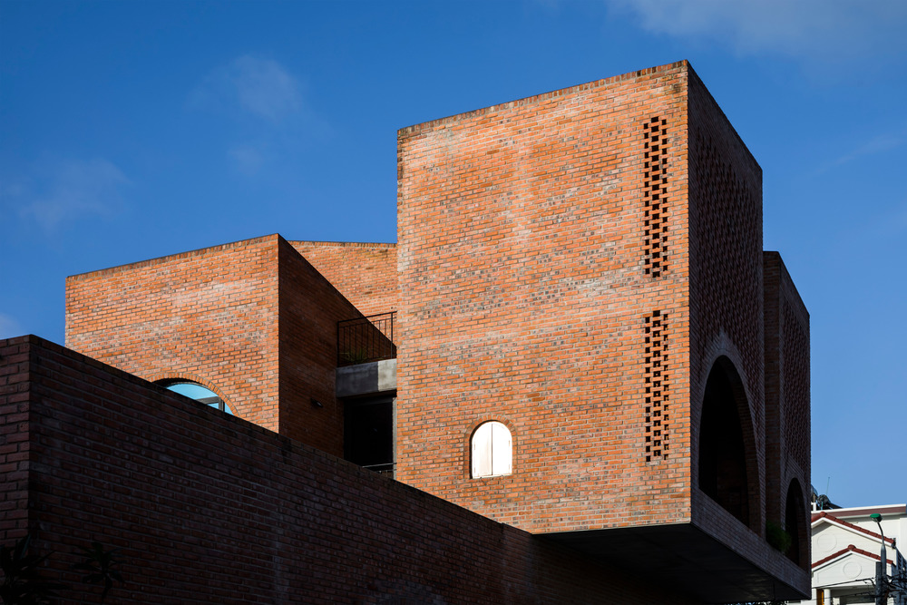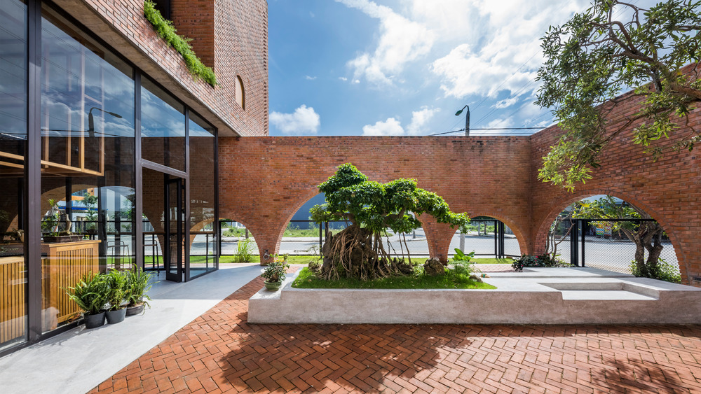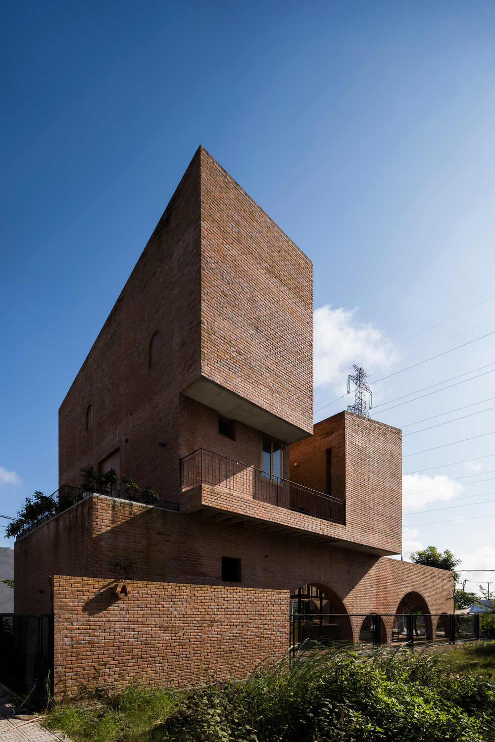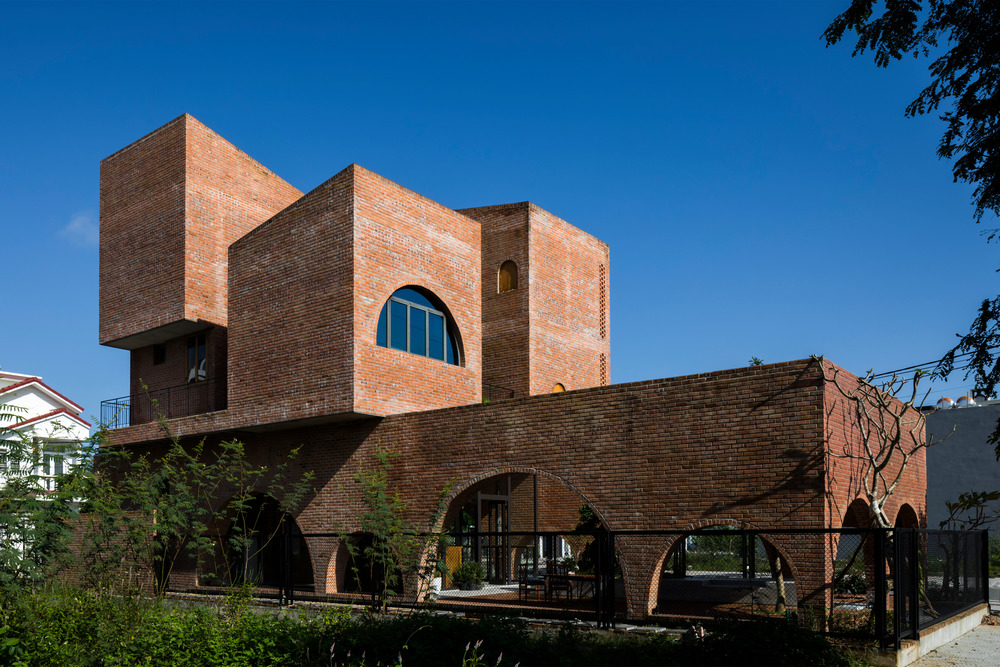 Located in an urban renewal zone by a river in Da Nang, Vietnam, this residential construction uses the ground floor as a small cafe formed by rectangular brick walls, while the upper floor is serves as the living space of a nuclear family, which is combined by three different blocks on a square plane.