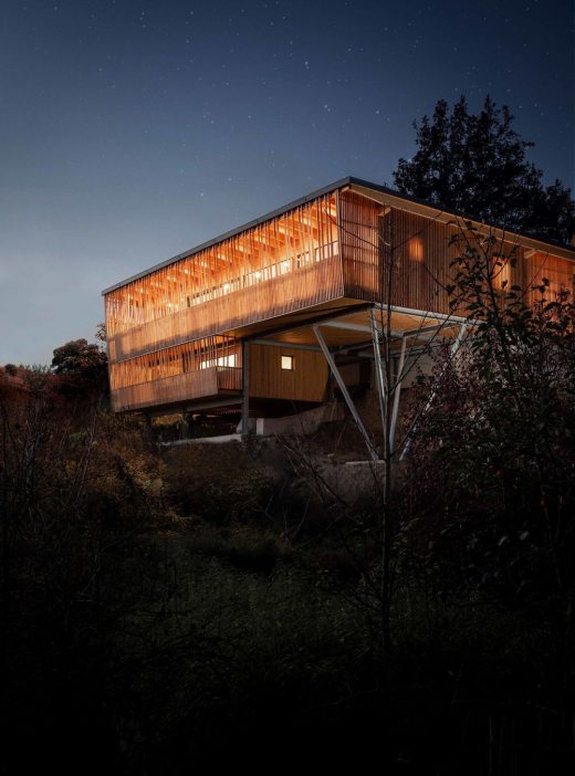 On the steep hillside plot, the “eco-house”, built on stilts and largely of wood, catches the eye through its imposing architecture alone. In order to avoid sealing the ground, Hörndler and Wizany deliberately decided against building a basement. A support structure made of recycled steel carries the house and makes it look like a floating “living box”. The wood used comes from sustainable Austrian forestry, the insulation is made of straw blown in after the wheat harvest, and in the interior, building panels made of straw, clay slabs, and clay plaster provide a climate-regulating effect.