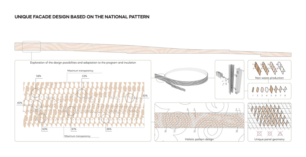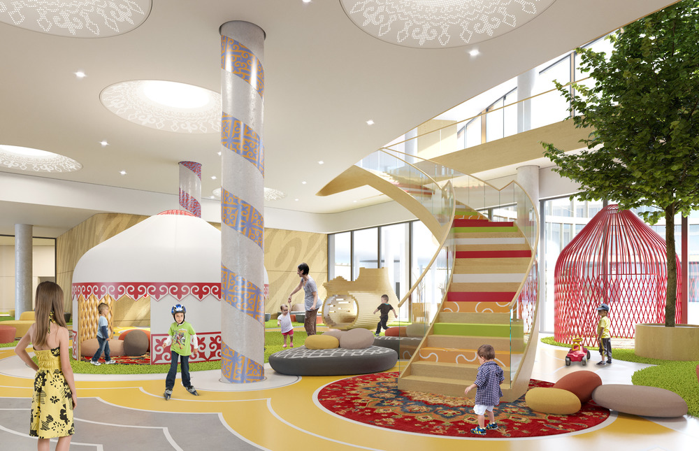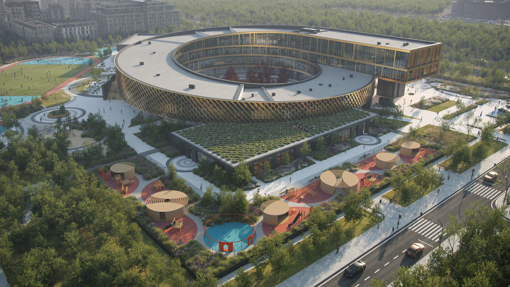 The Educational Complex in Nur-Sultan is a comfortable setting for children and teachers, the purpose of which is not only educational, but also inspirational. The projected buildings of the educational school and kindergarten create a unique environment for education and upbringing through the development of moral and spiritual values, based on the synthesis of Kazakh and world culture and art. The use of natural materials emphasizes the ecological orientation of the formed environment, and individual solutions make it possible to render the designed objects unique.