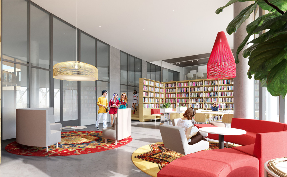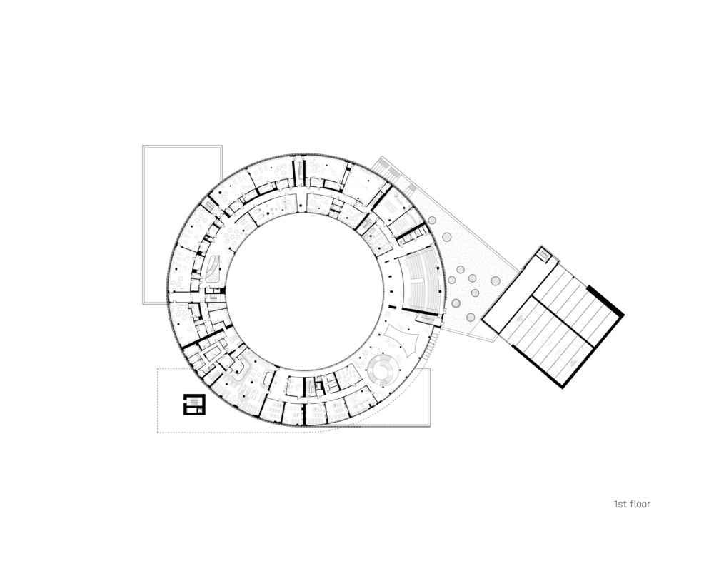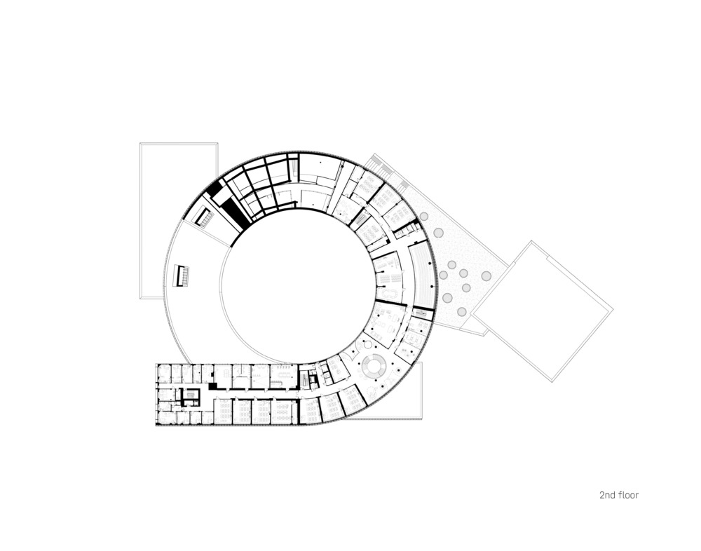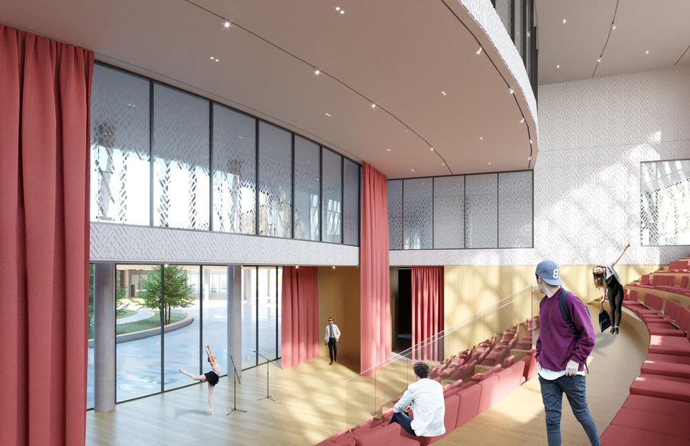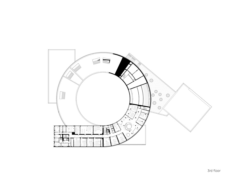 The central core serves as the main “square” of the building. This space serves as a lobby and a forum, as well as a place for recreational activities, and the area allows for the placement of stands for organized exhibitions of student creativity.
