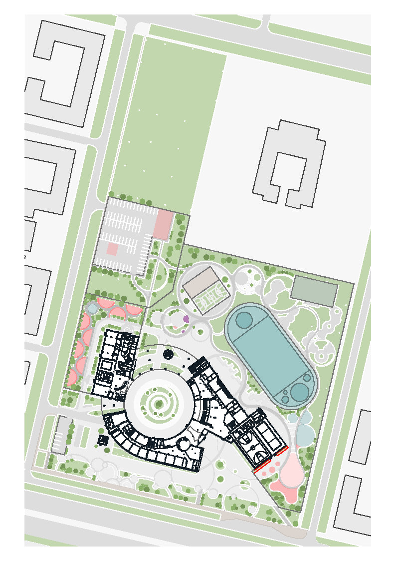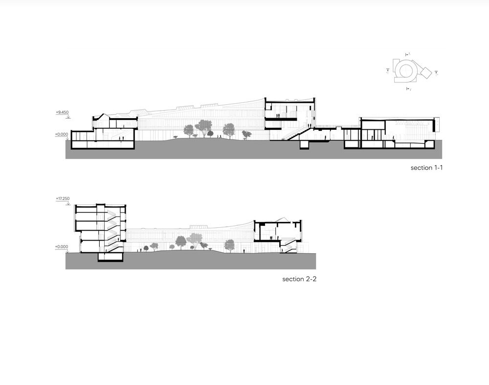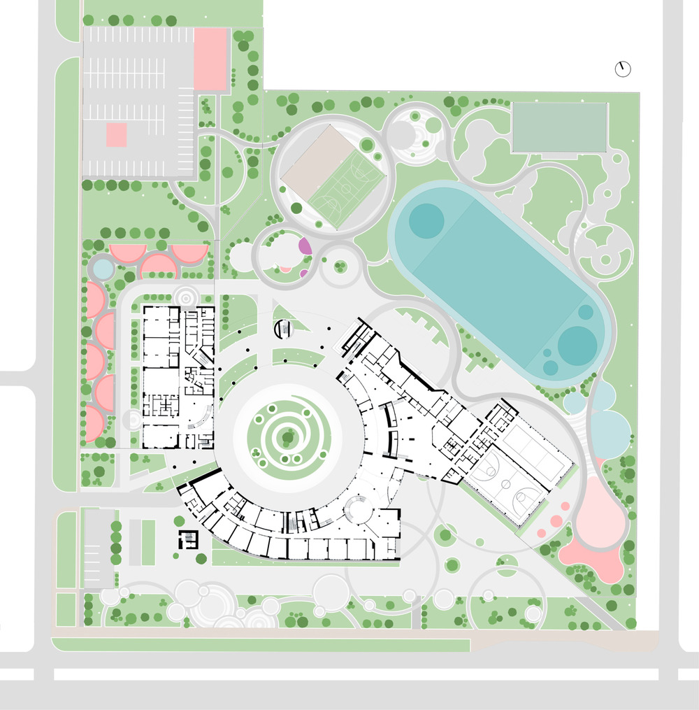 The project is based on a combination of the relief of the site, the wishes of the client, technical specifications, and the surrounding buildings. The school and preschool educational institution building was designed as a single compound, volume clad with metal perforated panels as a reinterpretation of local patterns. The building takes a spiral form based on parallelepipeds. The southeast block houses the school’s sports functions, and the west block houses the first floor of the preschool educational institution. The elementary school occupies part of the first two floors, and the rest is is dedicated to the high school.