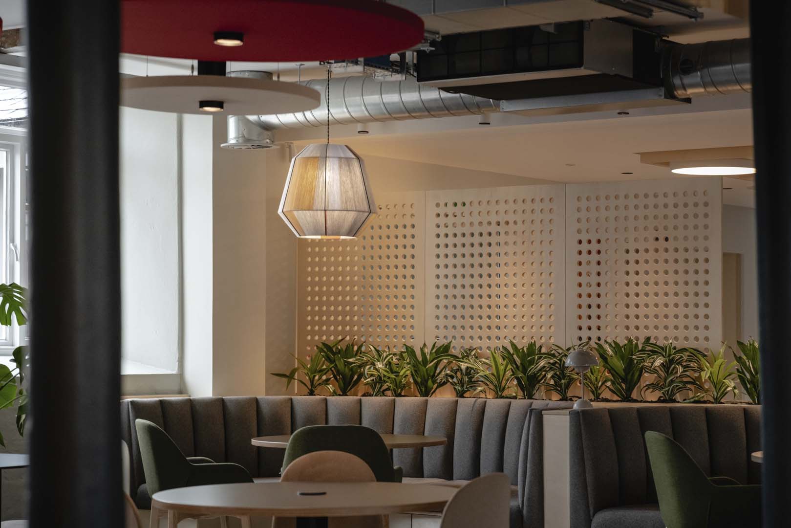 34 – Hay woven pendants over banquette seating