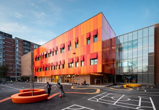 On the schoolyard side, transparency and color are more expressed, offering a personalized character to the institution and its active schoolyard. Aluminum panels in different shades of red and orange, create a link with the red color of the existing doors and windows, but also with the surrounding context, which contains “plexes” in brick of different shades of clay. This colorful facade makes its presence a principal element in the interior of the lobby but subtly asserts itself on Lajeunesse Street.