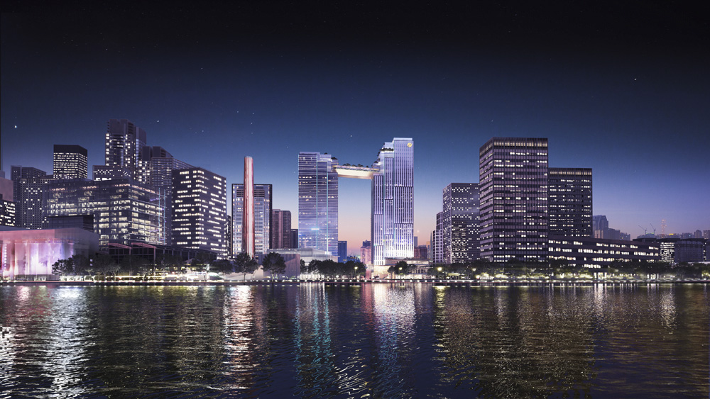 To maximise the valuable qualities of the site, 10 DESIGN has created a signature urban statement, an elevated public space where one can enjoy a spectacular view across the river to the striking skyline of Guangzhou. The sky deck provides a wide range of amenities for public enjoyment including al fresco dinning, a city park, an observatory deck, and a city art gallery.