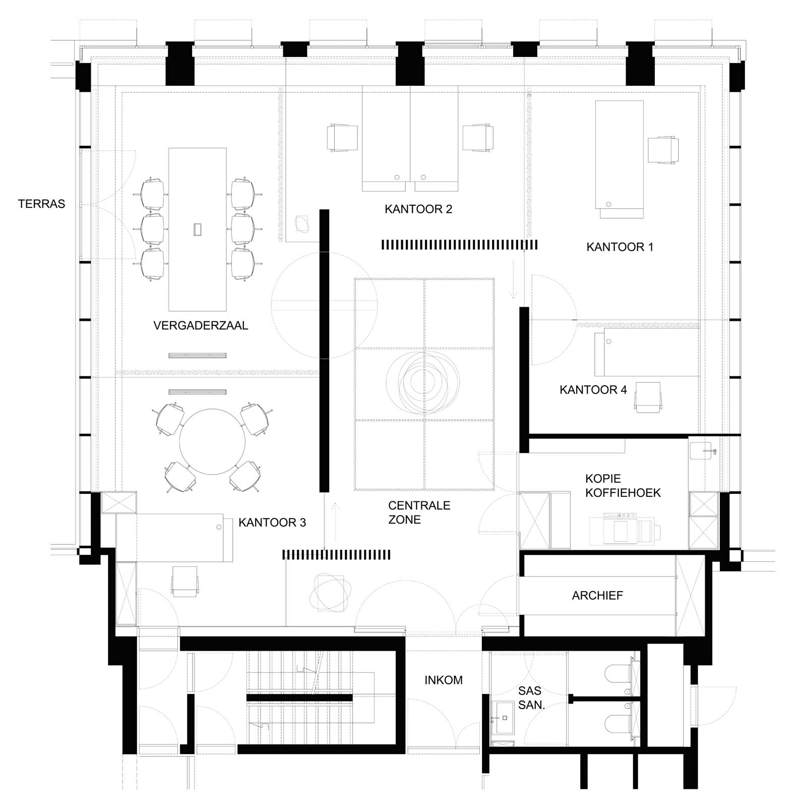 Glass partitions and walnut beams divide up distinct areas. The entrance with washrooms leads to the central area. System components and indirect lighting have been tucked away in the central area’s ceiling. To the right, behind closed white panels, there are filing cabinets and the copier/coffee corner with kitchenette. Behind another panel is an unobtrusive emergency exit. Although two offices have been segregated, they retain lines of sight thanks to the use of glazing. A large pivoting door provides access to the conference room that adjoins a patio. There are also a number of workstations.