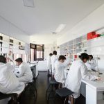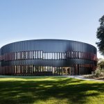 The brief for this new school building included a variety of general learning areas, provision for the senior year teachers and a science centre. The circular shaped plan had an appropriate civic quality based on the school’s original masterplan. However, rather repeating the circular pattern inside, the designers chose to use geometry and colour to define the central courtyards, light wells and learning spaces. The sharp angles and vivid colours of the interior form a dramatic contrast with the round form and muted tones of the drum-like outer structure.