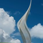 JACOB’S LADDER is 34 meters (112 feet) high and made out of square-sectioned steel tube weighing 46 tonnes. It is made from 480 lengths of steel, stacked one on top of each other. Each layer is slightly different in length and size, shifted and rotated relative to the layer below, ultimately producing the final gracefully curving shape—this despite the components themselves all being straight steel sections.