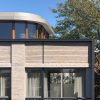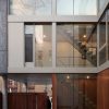 The project’s defining feature is the harmonious convergence of two distinct building bodies. A suspended brick volume intertwines with a vertical block of wood and glass, resulting in a visually stunning composition. This deliberate fragmentation allows the structure to seamlessly blend into the eclectic urban context of the neighborhood.