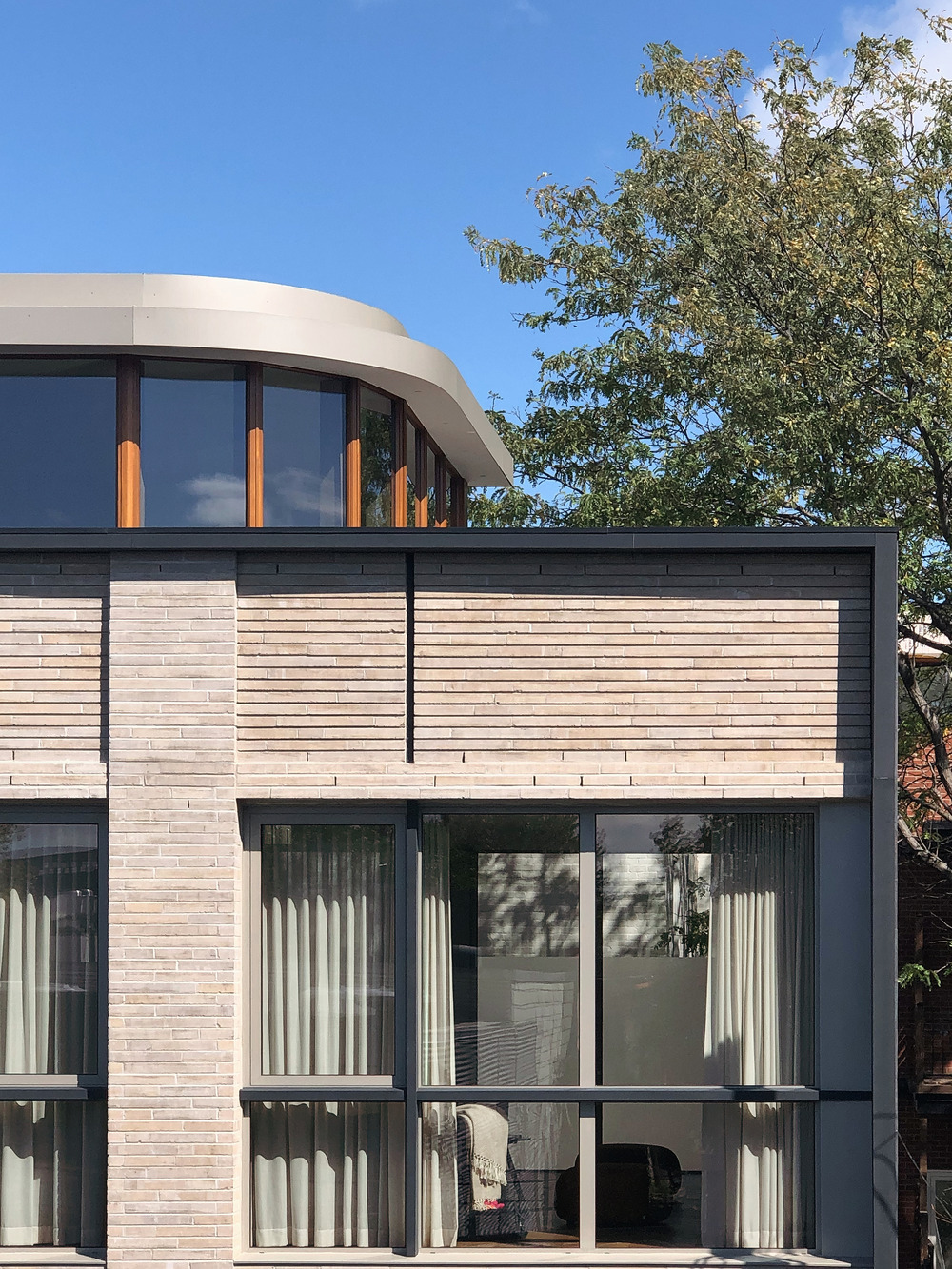 In addition to the brick volume, the base and crown of the building exhibit a captivating fusion of glass and wood. A gracefully curved volume, made of glass and wood, punctures through the mass of brick, creating a stunning vertical extrusion. This architectural element serves as a skylight, bathing the interior with natural light and expanding the space towards the heavens. Moreover, this vertical extrusion seamlessly integrates the staircase providing access to the roof terrace, revealing breathtaking panoramic views of the cityscape as one ascends.