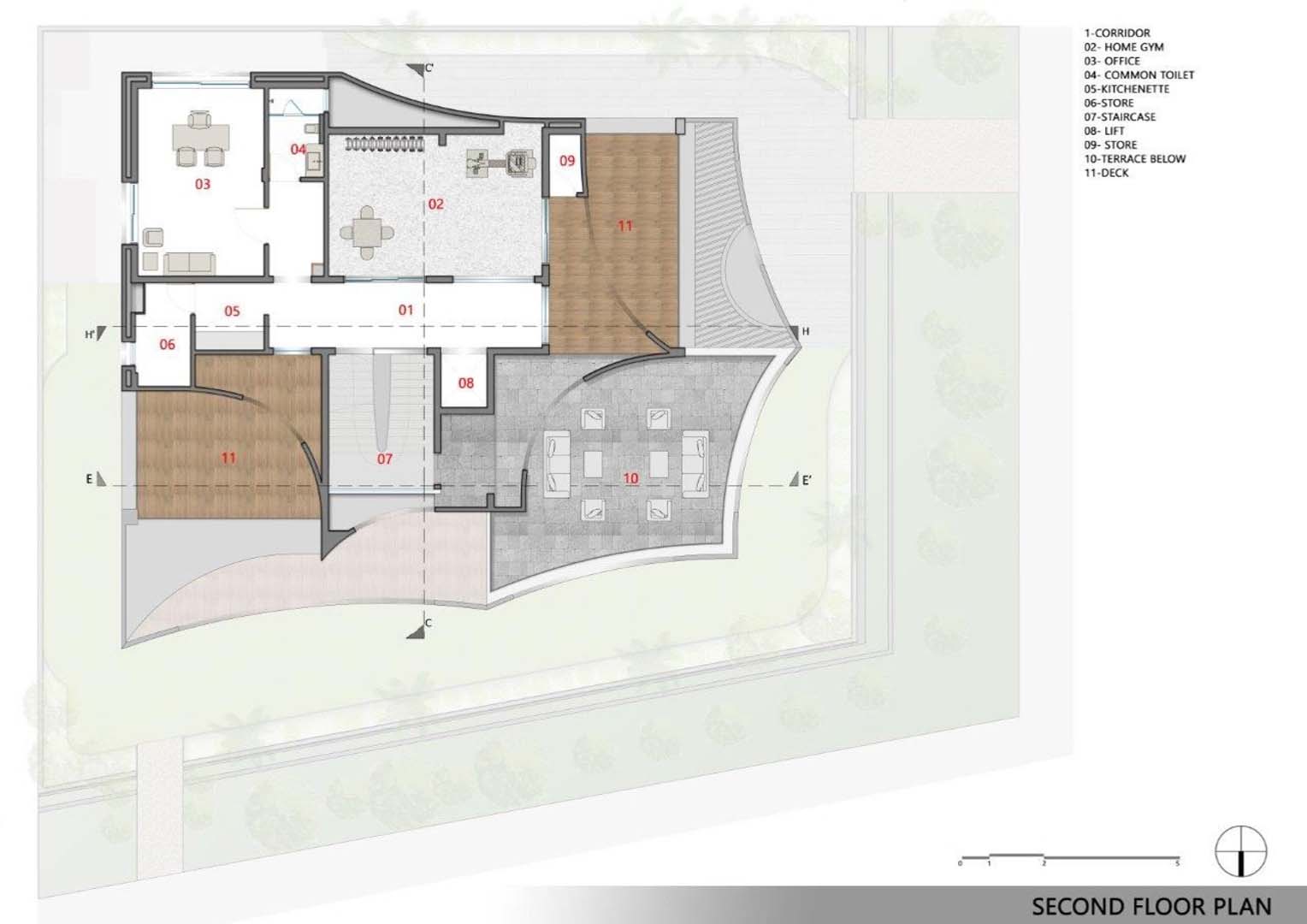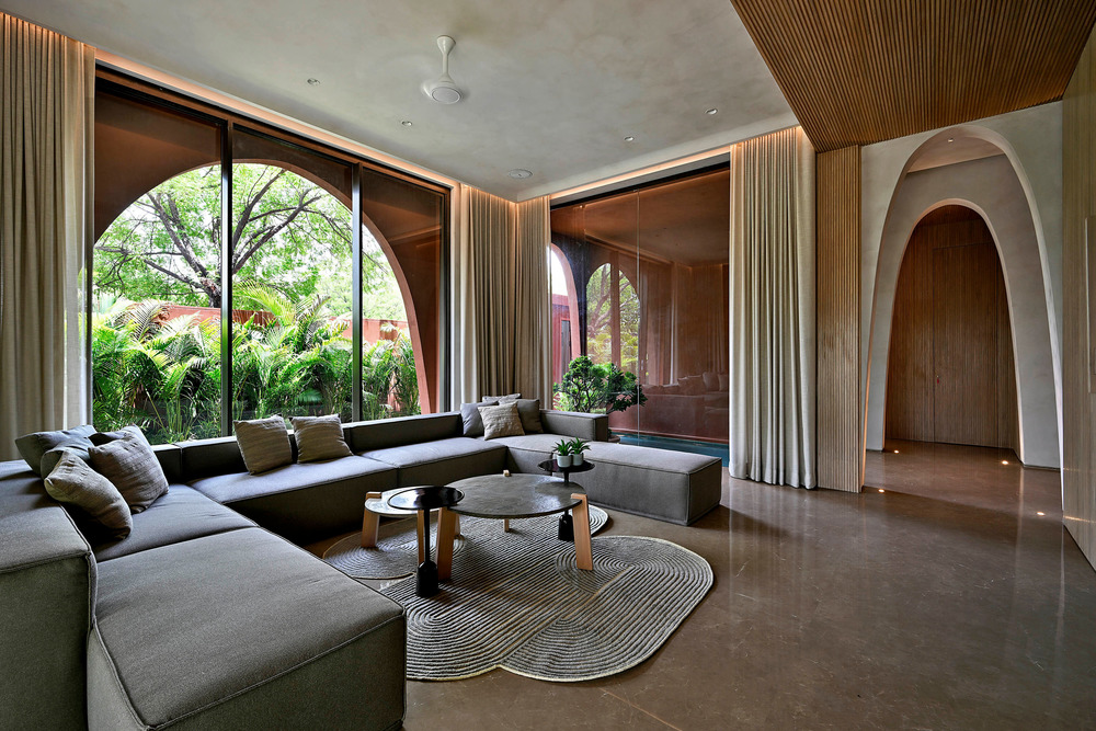 A curvilinear punctuated envelope surrounds the house, creating interstitial, semi-open spaces all along the perimeter, with deeper recesses on the garden-facing sides. This envelope reduces the heat gain substantially, while providing sheltered open spaces around the house to each room. Designed to mitigate heat gain in response to the hot avid climate of its location, this envelope keeps the entire house cool in the hot summer months, when temperatures rise in excess of 40°C for 8 months of the year.