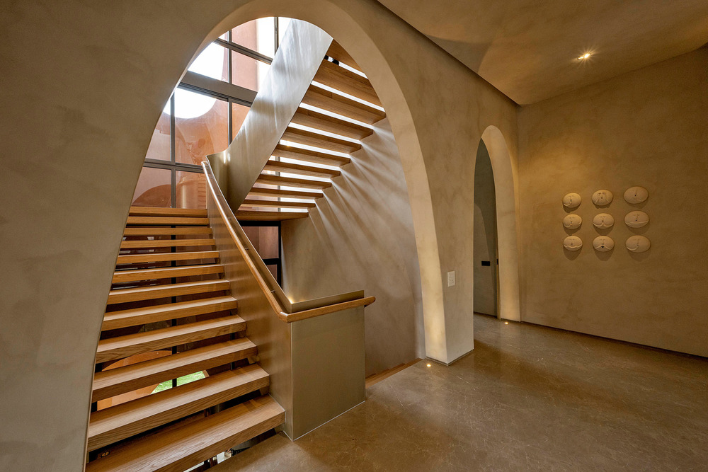 This sculptural house is contextual to its surroundings, the climate, and the owner’s needs, resulting in an interesting play of volumes, open, enclosed, and semi-enclosed spaces at every level. The design creates energy-efficient spaces with reduced heat gain and indirect natural light in each part of the house.