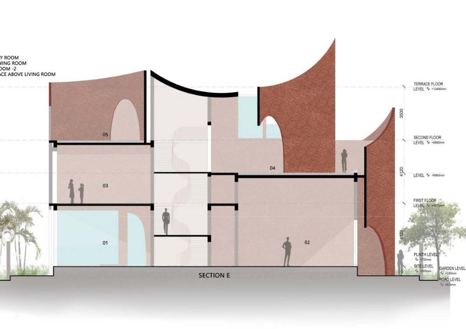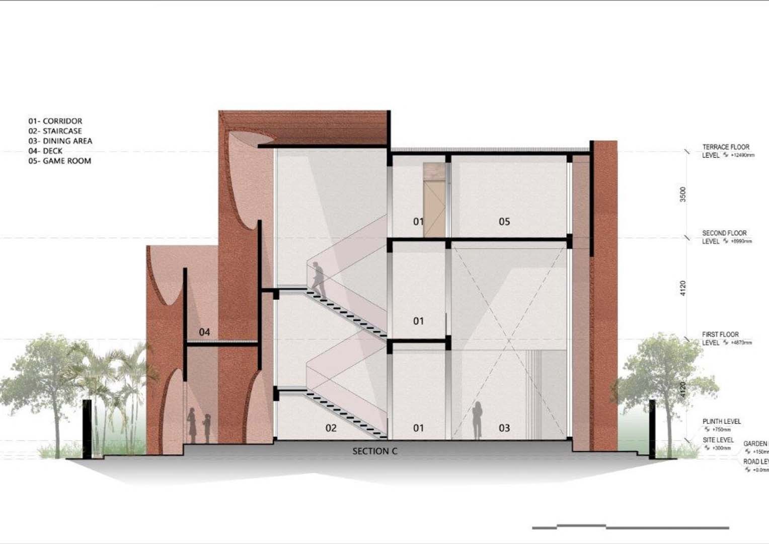 Sectionally, the heights within it are varied with an interesting play of volumes in each part of the house, including bedrooms of a single volume, a dining area of a double volume, and a living area of an intermediate 1.5 level volume.