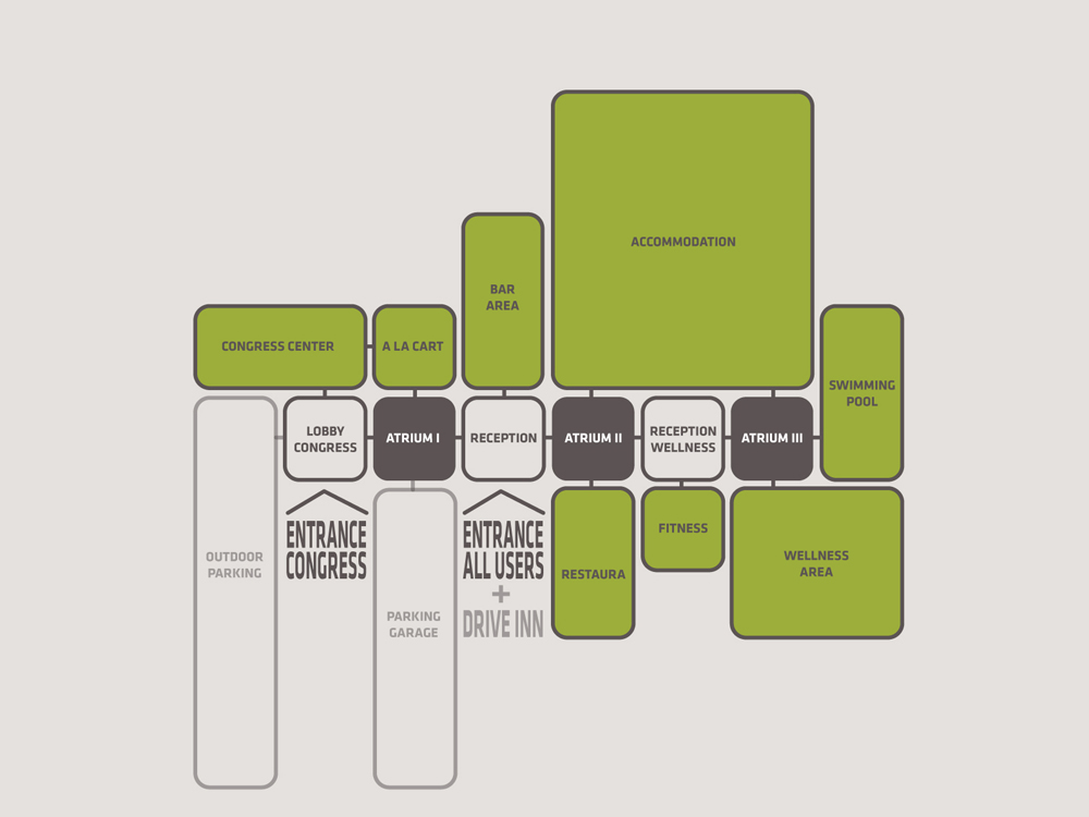 100% view on nature; A perfect view on nature means a view of nothing but nature. If it is self-understood that the users of the hotel shouldn’t be able to see a main road near the resort, it is crucial for them not to see the access road to the hotel itself, either. It is important that, there is an unobstructed view on nature also from each programme cluster available for use by the guests without them also seeing the users of other programmes.