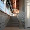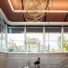 Stepping inside the pavilion, visitors are greeted by a space that is as functional as it is visually appealing. The transparent walls and carefully aligned floors promote clear visibility and ease of movement, fostering a sense of openness and connection to the urban environment. The interior design draws inspiration from Montreal’s iconic metro stations, featuring a chevron-grooved concrete treatment that adds a touch of geometric flair. A suspended installation by local artist Philippe Allard further enriches the space, providing a unique visual identity that complements the architectural elements. Accessibility is a key focus, with an integrated elevator ensuring that the pavilion is welcoming to all.