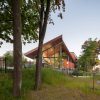 One of the standout features of the new pavilion is its seamless integration with the surrounding natural environment. The project team faced the challenge of working within a small and complex site while preserving existing woodlands and biodiversity. They succeeded in creating an underground rail connection that respects the natural landscape. The spacious glass box beneath the distinctive roof allows natural light to flood the interior, creating a welcoming and airy atmosphere. This thoughtful design ensures that the pavilion harmonizes with its surroundings, enhancing the area’s natural beauty rather than disrupting it.