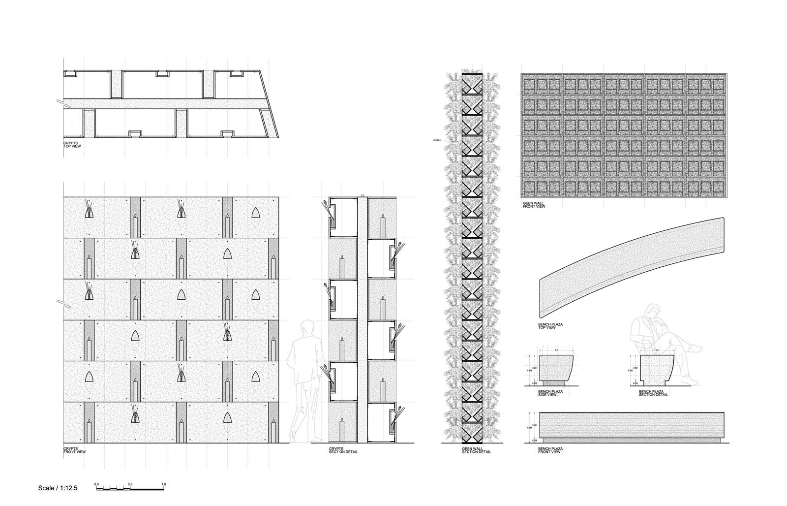 – Crypts access through plaza with stairs,