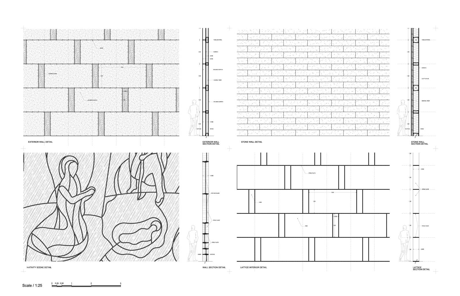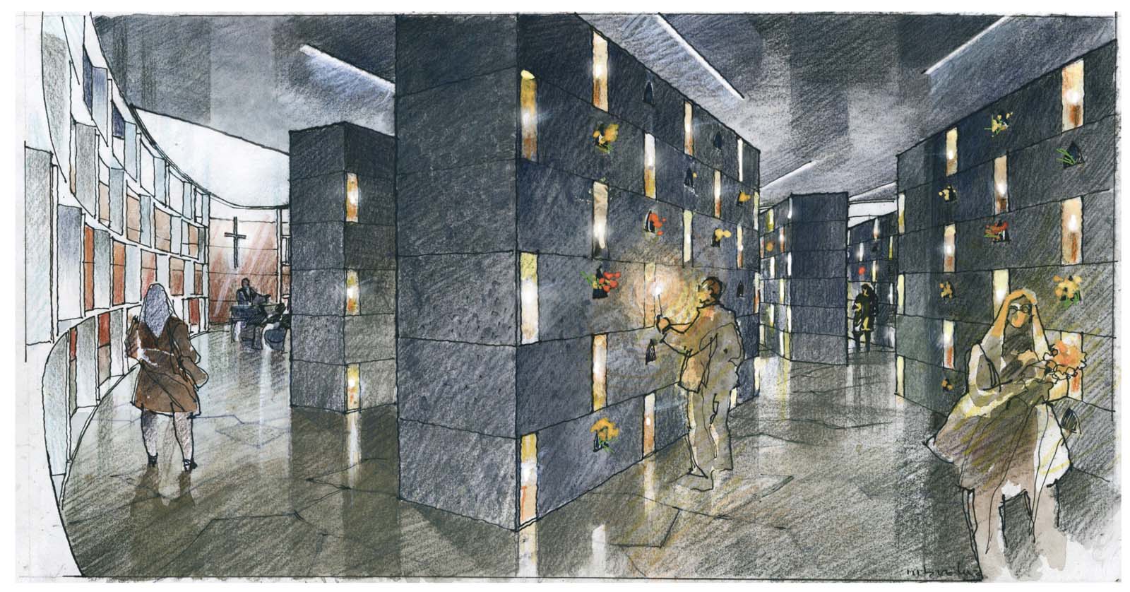 The Nativity is proposed as a large thematic stained-glass window drawing that also works as the structural piece that holds this church area. The colours used in this work have a symbolic and decorative function as well.