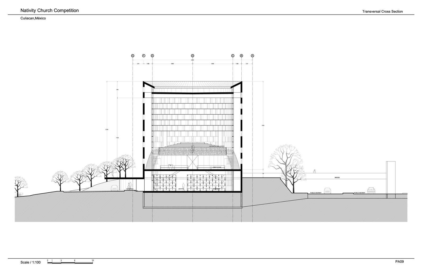 The bridge must not compete with the church, so it is going to be made of the lightest possible steel structure and glass enclosure, being the bottom of it done in a double translucent glass layers that are lit at night.
