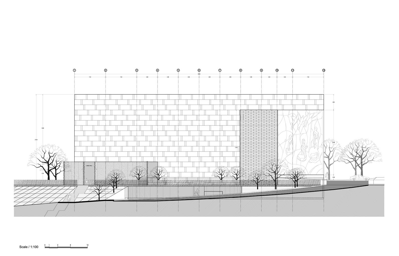 - The green wall in the Plaza creates a contained place and together with the shadow of the church it generates a microclimate, it acts like a veil which allows discovering through it the surrounding landscape.
