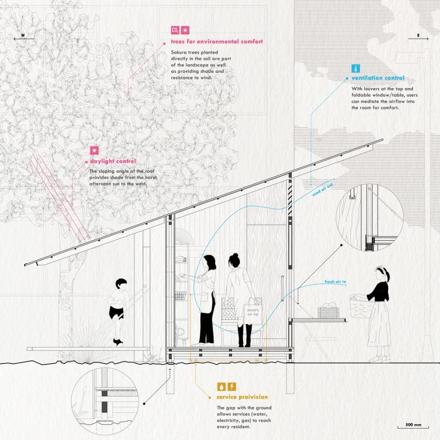 In a society like Japan, where the nuclear family is often seen as the ideal, single mothers frequently face social stigma and marginalization. New Domesticity challenges these cultural norms by proposing a new model of family and community. Instead of traditional, isolated housing units, this project envisions living spaces that encourage connection, adaptability, and inclusivity.