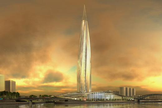 The Okhta Centre will become the new contemporary headquarters of Russia’s state-controlled gas company Gazprom. The 77ha centre will include a 396m-tall glass tower – set to become Europe’s tallest building – as well as several other office buildings, a concert hall, a museum, a sporting arena and public green areas. Built on the city’s main waterway, the River Nera at a derelict industrial site, the pentagonal tower will be made of glass that will reflect the movement of the water. The frame is made of steel, with stainless steel cladding and a concrete core. The column twists up from the ground, and as the light hits it at different angles at different stages throughout the day the tower will give the appearance of changing colour. The tower is due to start in 2008 and be completed in 2012. The development is being funded with the St Petersburg City Administration paying 24.9 billion rubles ($1 billion), and Gazprom subsidiary Gazprom Neft providing 30.6 billion rubles ($1.4 billion). UK-based international architectural firm RMJM was appointed in December 2006 to design the new headquarter of Gazprom and the wider Okhta Centre. RMJM beat off 5 other internationally-renowned architects for the commission.