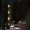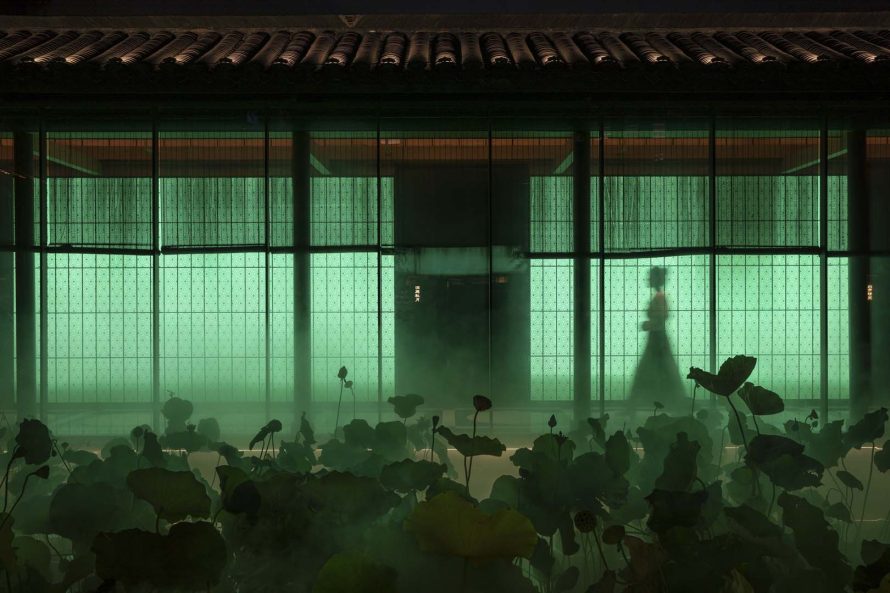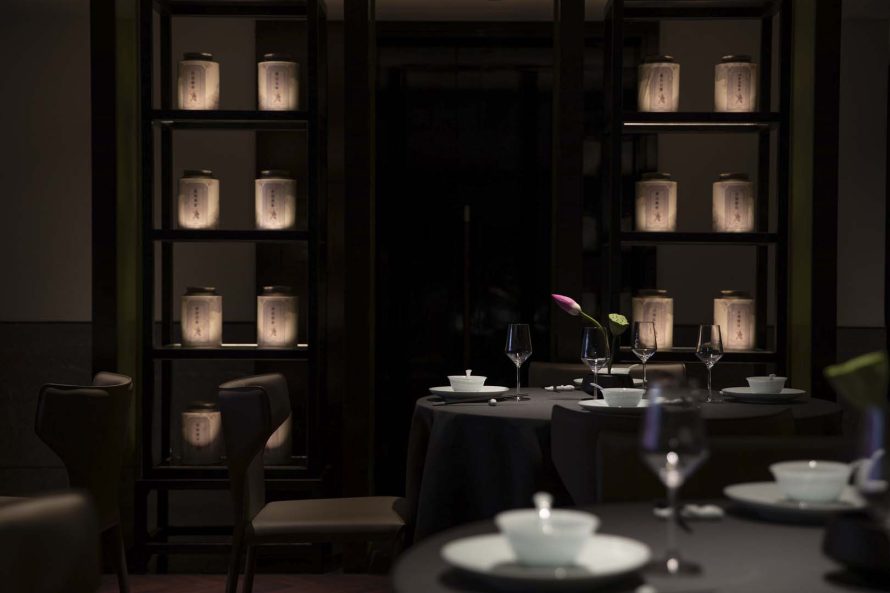 Freestanding illuminated shelves, strategically placed, offer subtle division between dining areas, ensuring privacy while showcasing traditional tea containers from Hangzhou and Hunan. These containers, reflected on the shelves’ surfaces, add to the calm, reflective quality of the restaurant, much like the serene surface of West Lake.