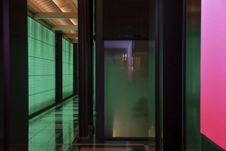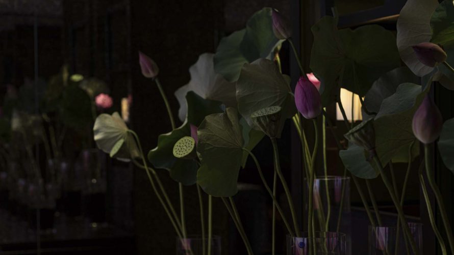 Walking through the restaurant, guests will notice the central hallway, which is adorned with cylindrical vases filled with lotus flowers. This design element acts as a visual separator between the hallway and the main dining room. Mirrored panels and pink lightboxes enhance the feeling of space, creating an ambiance that is both welcoming and visually stimulating.