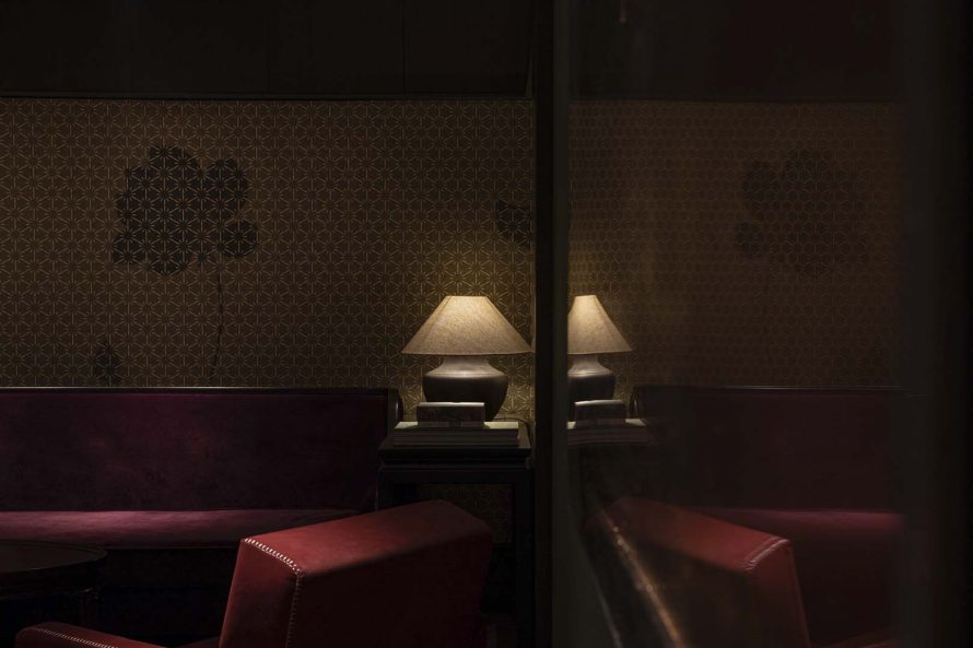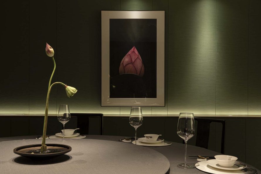 Inside, the Purple Garden Restaurant continues its tribute to traditional aesthetics with private dining rooms that overlook the lotus pond. These rooms are designed to offer a secluded, intimate dining experience. High ceilings maintain the original building’s sloped roof design, creating a spacious and airy atmosphere. The walls, adorned with dyed silk in soft greens and blue-purples, evoke the colors of midsummer lotus leaves.
