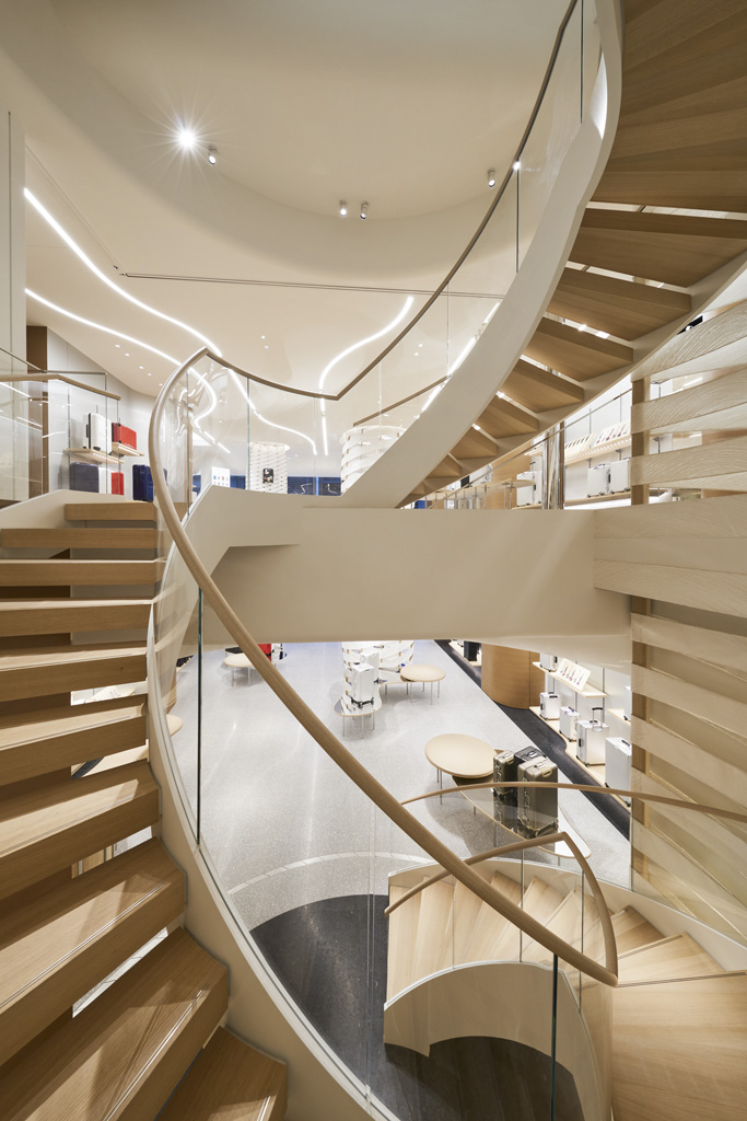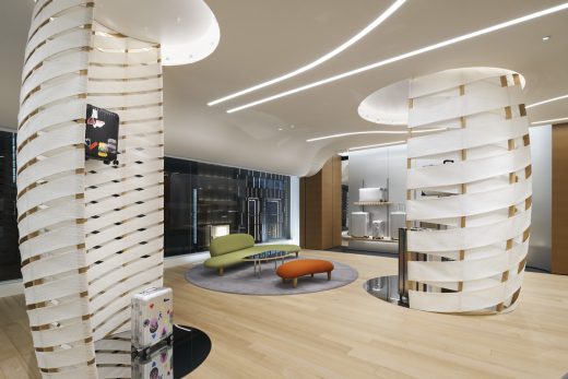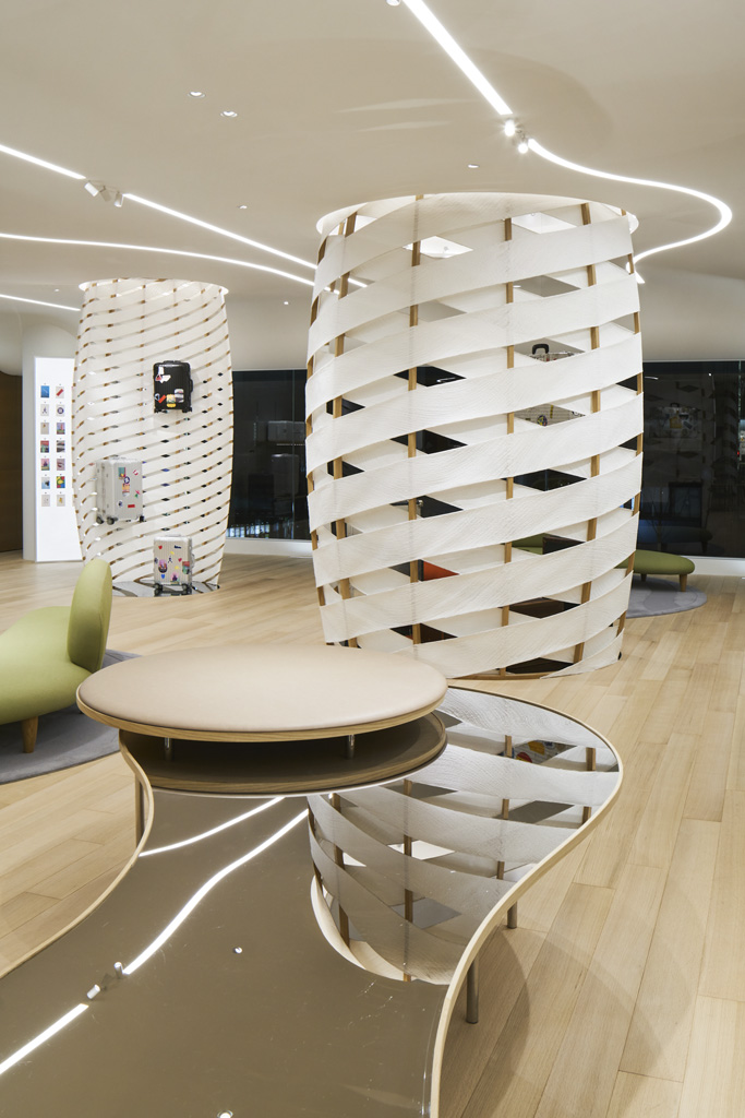 Along the way, customers encounter the baskets, woven room dividers that connect the two floors vertically. Each of these creates a point of attraction within the room. The baskets are a modern interpretation of Japanese handicraft. Inspired by the traditional shoji, the sliding doors or room dividers made of bamboo and translucent paper, the baskets form intricate braids made of filigree oak wood slats and handmade Japanese paper (washi).