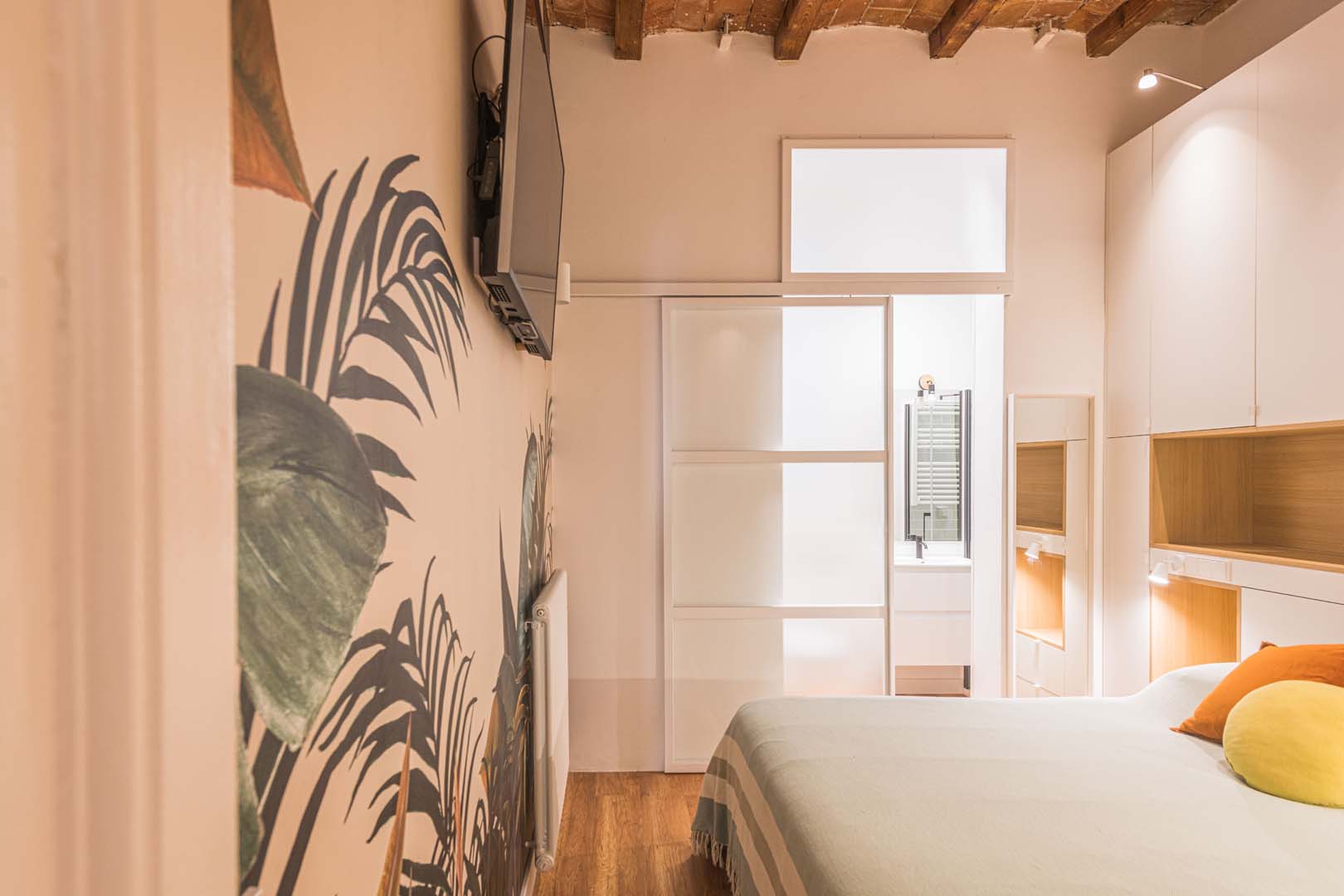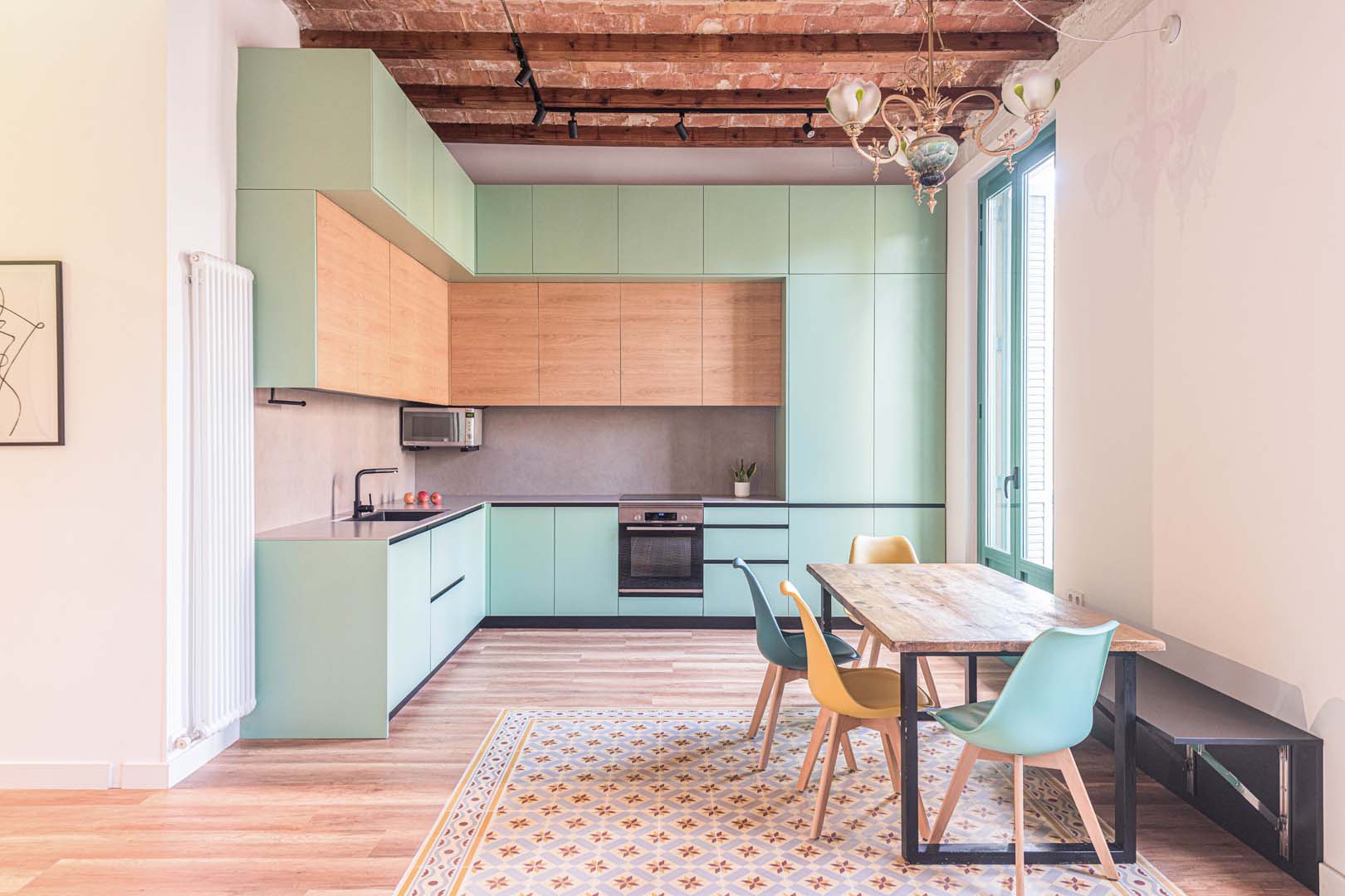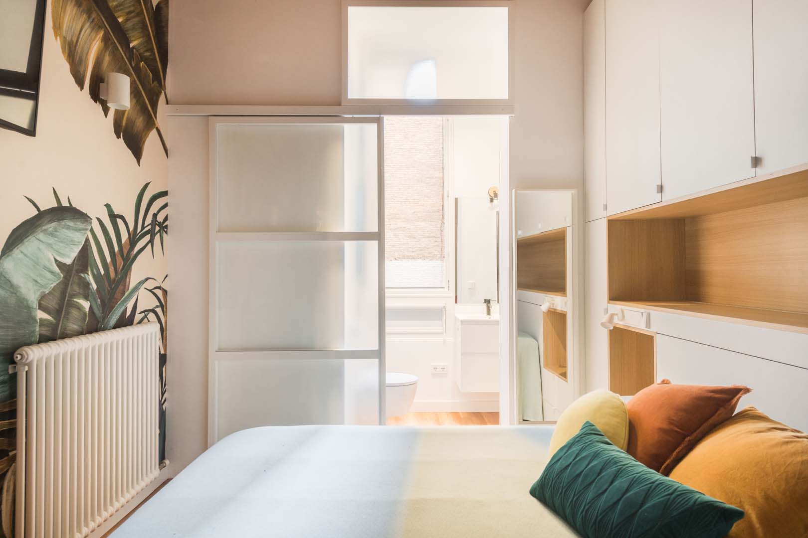A commitment to sustainability defines Selva Roja. Locally sourced, recycled tiles lend the bathrooms an artisanal charm with their irregular textures, while water-saving fixtures provide both functionality and environmental mindfulness. The kitchen features a countertop made from 50% recycled materials, designed to be 100% recyclable after its lifecycle. Non-toxic, silicate-based paint not only enhances the indoor air quality but also helps regulate humidity, an essential feature in Barcelona’s climate. Together, these choices reflect a deliberate effort to minimize environmental impact without compromising on quality or design.