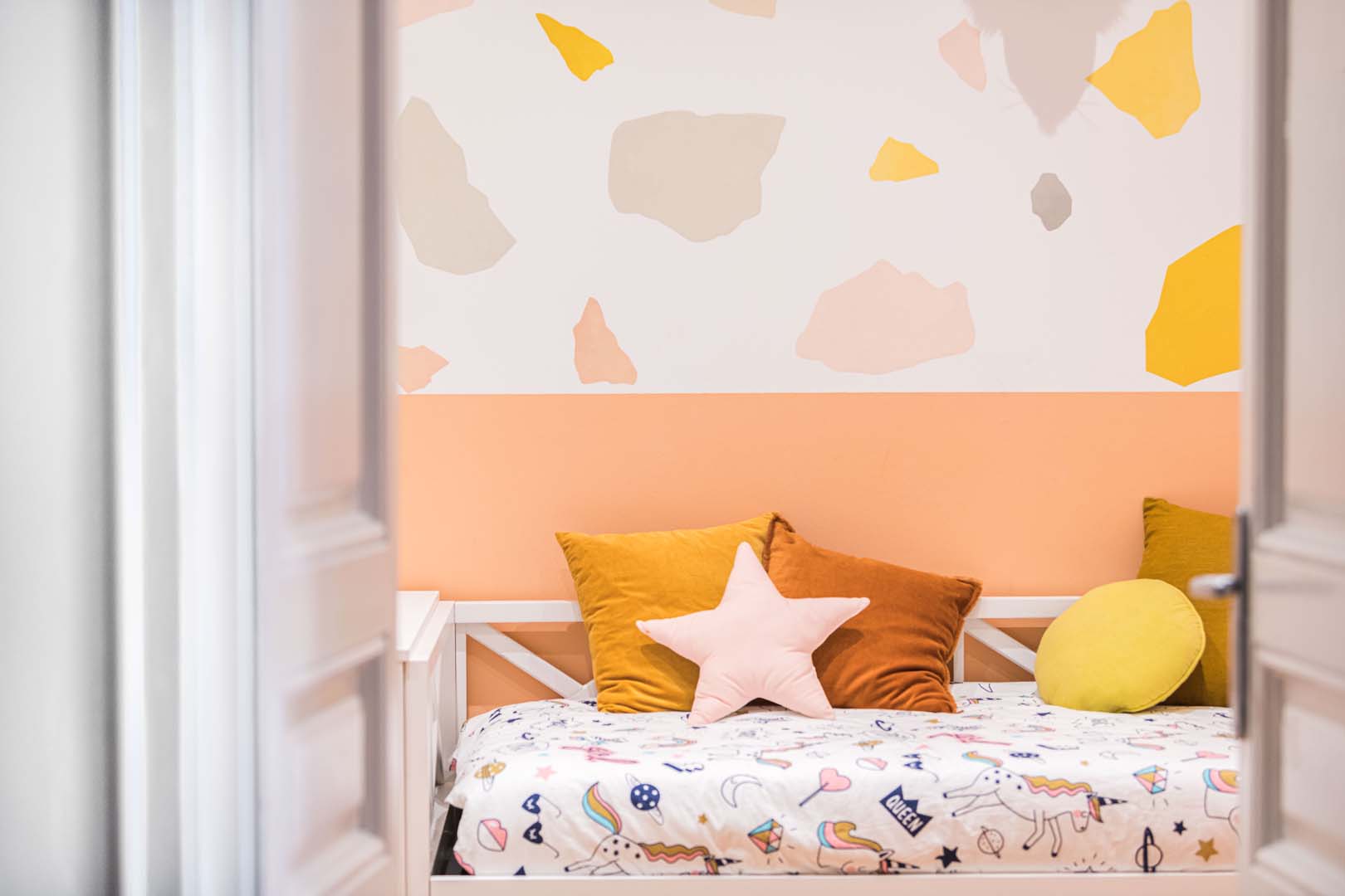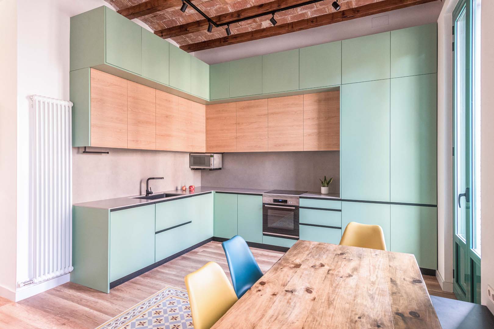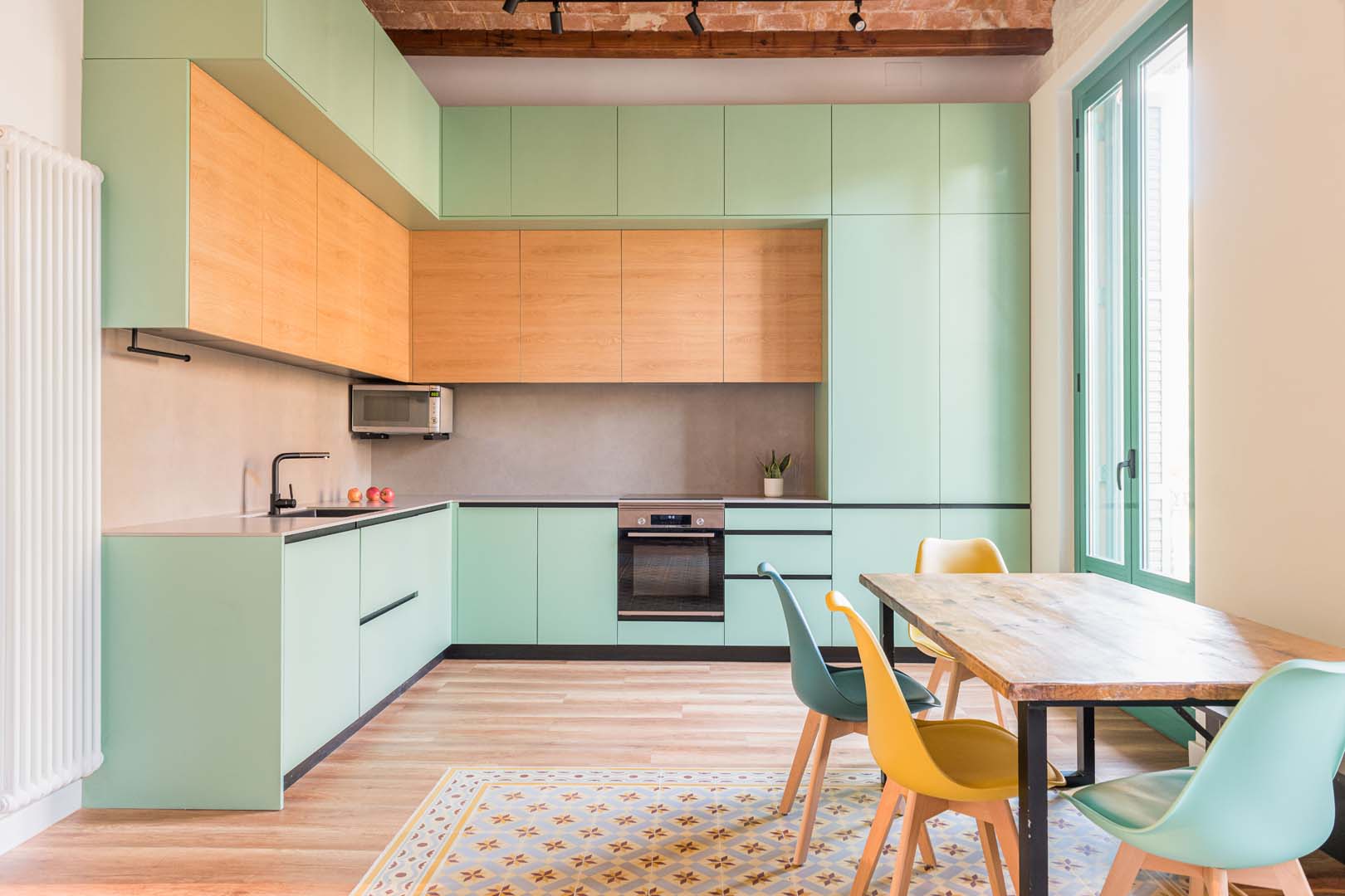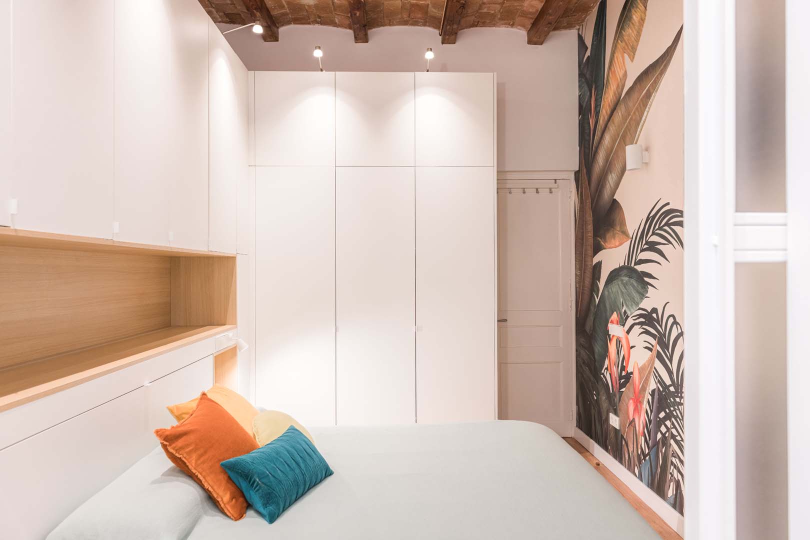 A commitment to sustainability defines Selva Roja. Locally sourced, recycled tiles lend the bathrooms an artisanal charm with their irregular textures, while water-saving fixtures provide both functionality and environmental mindfulness. The kitchen features a countertop made from 50% recycled materials, designed to be 100% recyclable after its lifecycle. Non-toxic, silicate-based paint not only enhances the indoor air quality but also helps regulate humidity, an essential feature in Barcelona’s climate. Together, these choices reflect a deliberate effort to minimize environmental impact without compromising on quality or design.