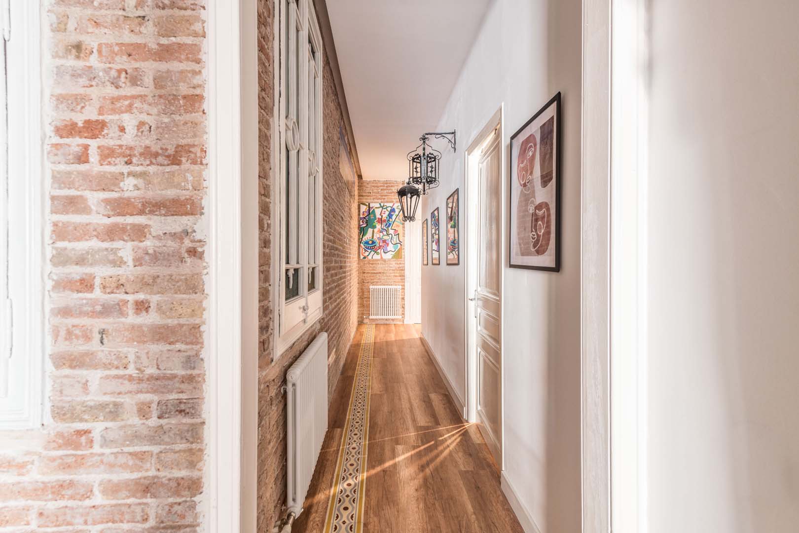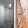 The project’s core vision was to celebrate the apartment’s existing elements while introducing thoughtful updates to meet modern living needs. Original wooden beams and ceramic ceiling tiles, discovered to be in excellent condition, were meticulously restored. Exposed brick walls were revived, adding texture and warmth to the interiors. Even the original window frames were preserved, showcasing their timeless craftsmanship. To integrate these features into a more fluid layout, interior doors were repurposed and repositioned, ensuring continuity with the apartment’s historical character.