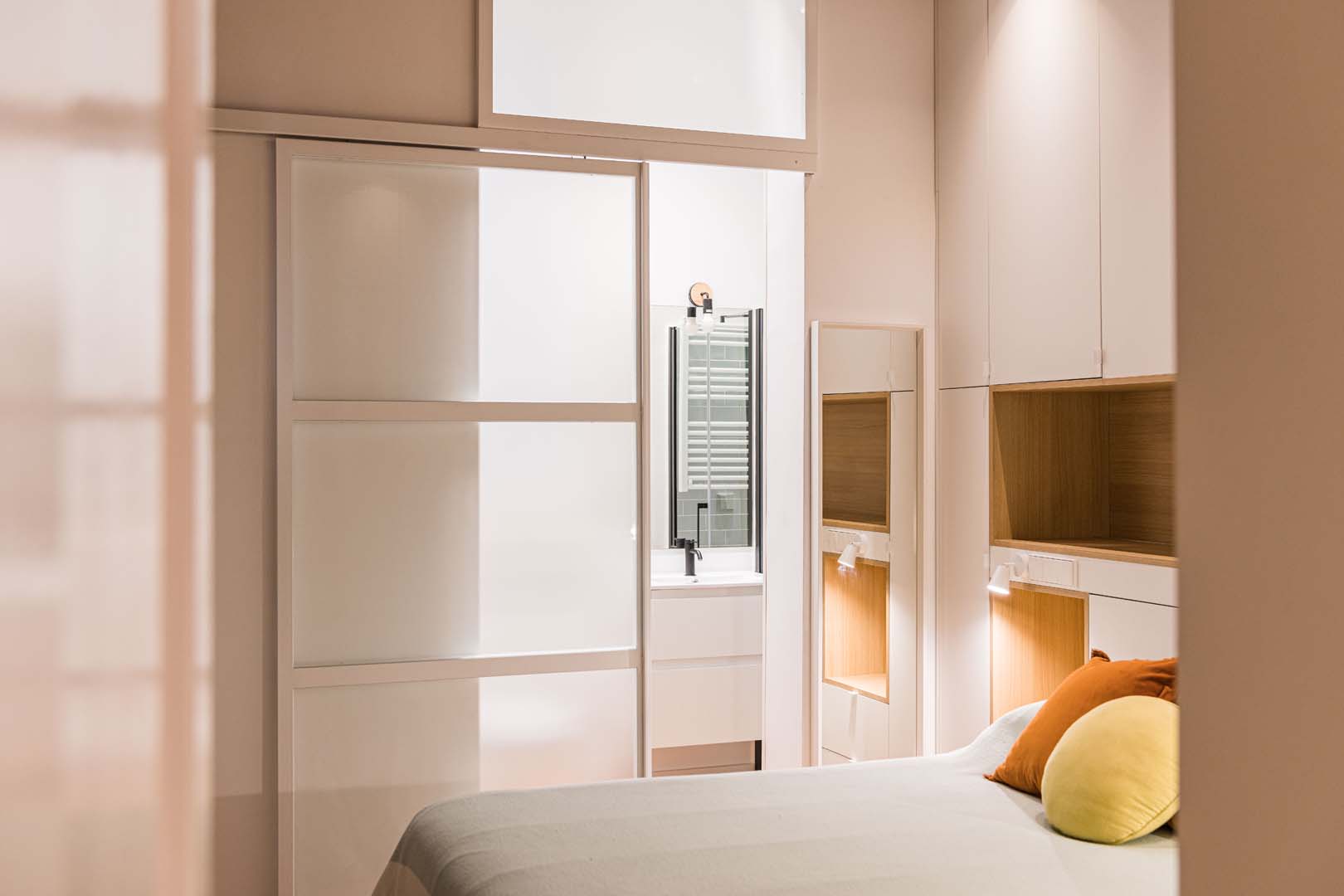 Functionality plays a significant role in the redesign, marked by subtle yet impactful architectural solutions. Sliding doors, for instance, were used innovatively: one separates the dining area from the entryway, another in the children’s room doubles as a wardrobe door, and a third made of steel and glass divides the suite bathroom while allowing light to flow into the bedroom. Natural light was prioritized throughout the home, reducing reliance on artificial lighting and creating a more inviting ambiance. The renovation also addressed comfort, incorporating thermal and acoustic insulation while ensuring that modern upgrades didn’t interfere with the apartment’s aesthetic integrity.