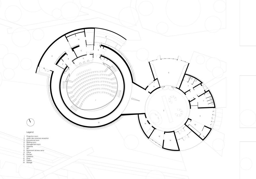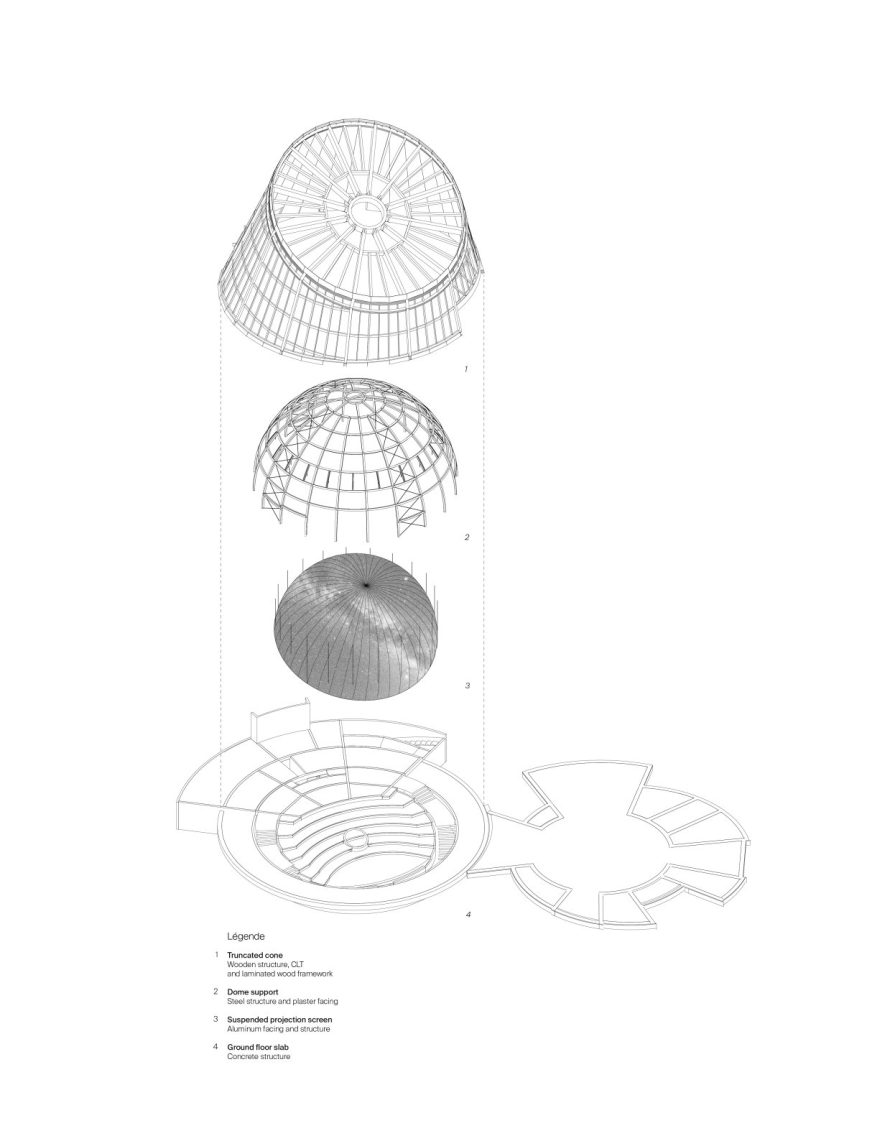 Program: 15 m diameter projection room with services, Jardin des sciences reception area, cafeteria, educational room and store.