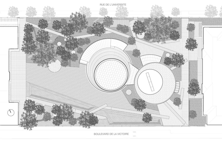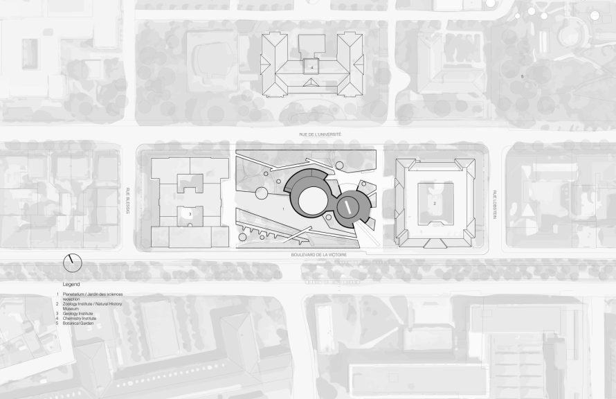 The Planétarium’s design draws inspiration from the cosmos and astronomy, taking visitors on an otherworldly journey. Situated between the Zoology and Geology institutes, the planetarium comprises two distinct volumes: a truncated cone housing a 138-seat projection room and an entrance gallery, and a cylindrical volume accommodating the Jardin des Sciences’ lobby and related services. The juxtaposition of these volumes symbolizes the connection between the sky and the earth, echoing the age-old human quest for knowledge of the universe.