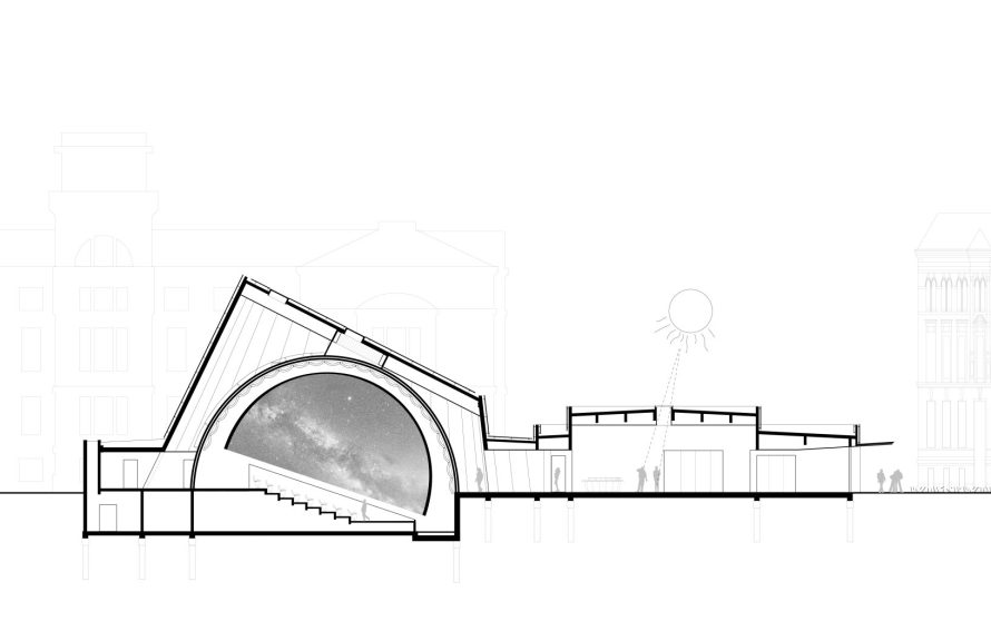 The architectural design pays homage to 19th-century machine buildings found on the site, such as the observatory’s dome. It also evokes the elegance of astronomical measuring instruments like the astrolabe. The metal disc atop the truncated cone responds dynamically to the changing colors of the sky, making the planetarium a captivating sight for passersby. For local residents, the planetarium resembles an astronomical instrument set amidst a lush garden, inviting contemplation.