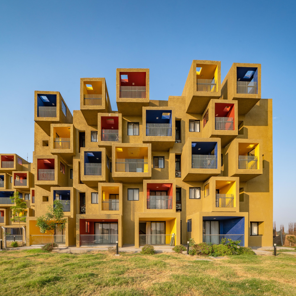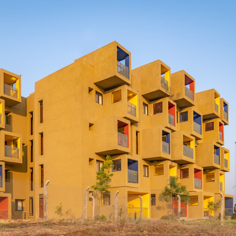 Composition of coloured cuboids defines this sculptural residential project. The brief for these mid-rise buildings in Kodla, Karnataka, India was to create studio apartments, a hostel, and a guest house to house workers of a new cement plant, on the perimeter of a housing project for a residential township.