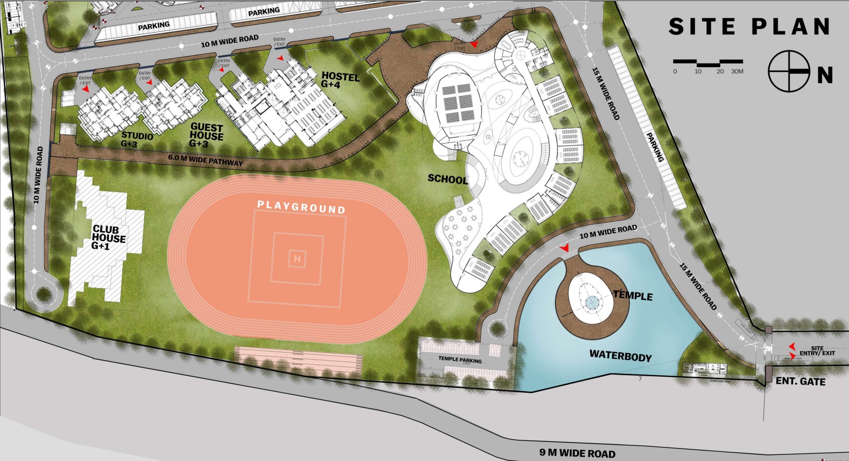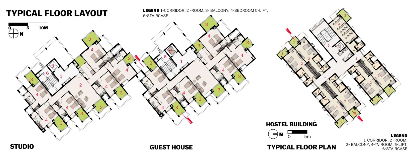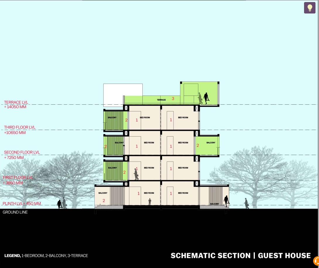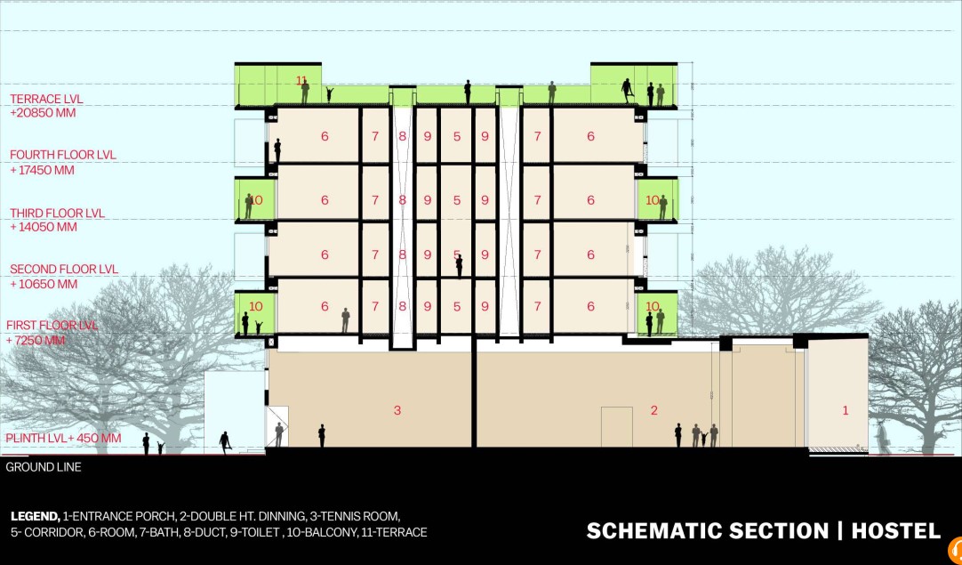 The brief calls for 18 studio apartments, 54 hostel rooms, and 18 guesthouse rooms to be created in buildings of 4 & 5 levels, all facing large landscaped areas and a large playground to the northeast. Common facilities, including a cafeteria, a game room, a lounge, and a gym are housed on the ground level. Rooms opening onto sheltered north-facing balconies occupy the upper floors.