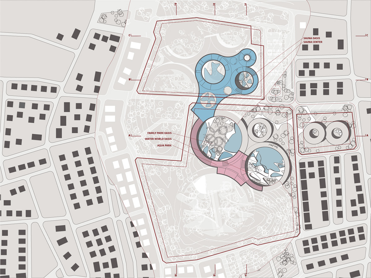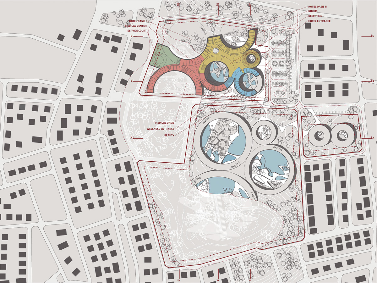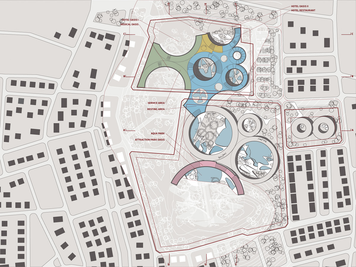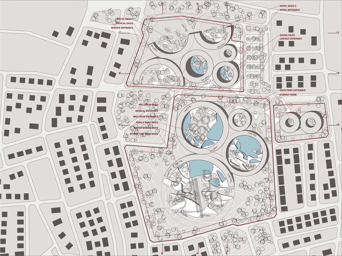 Tetusa Oasis Thermal Resort is an extensive wellness and medical facility set in the midst of low-rise housing area in coastal town Cesme in Turkey. In this well known leisure town with a long history of thermal water exploitation the decision was made to enrich the town’s offer with new central thermal complex including spa, water park, hotel, medical prevention center, elderly care facility and some other supporting programs.